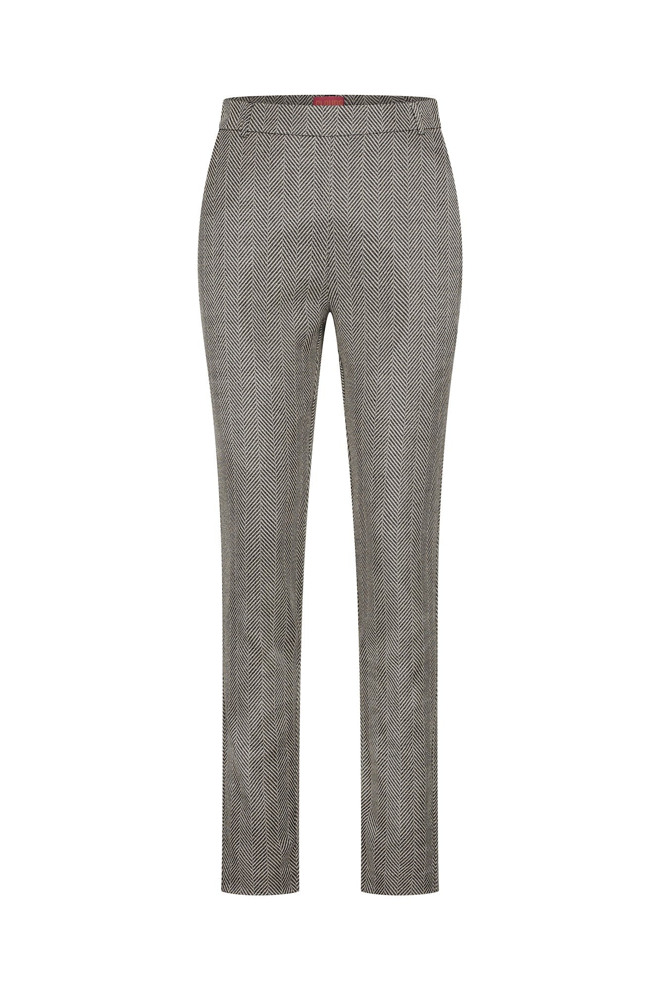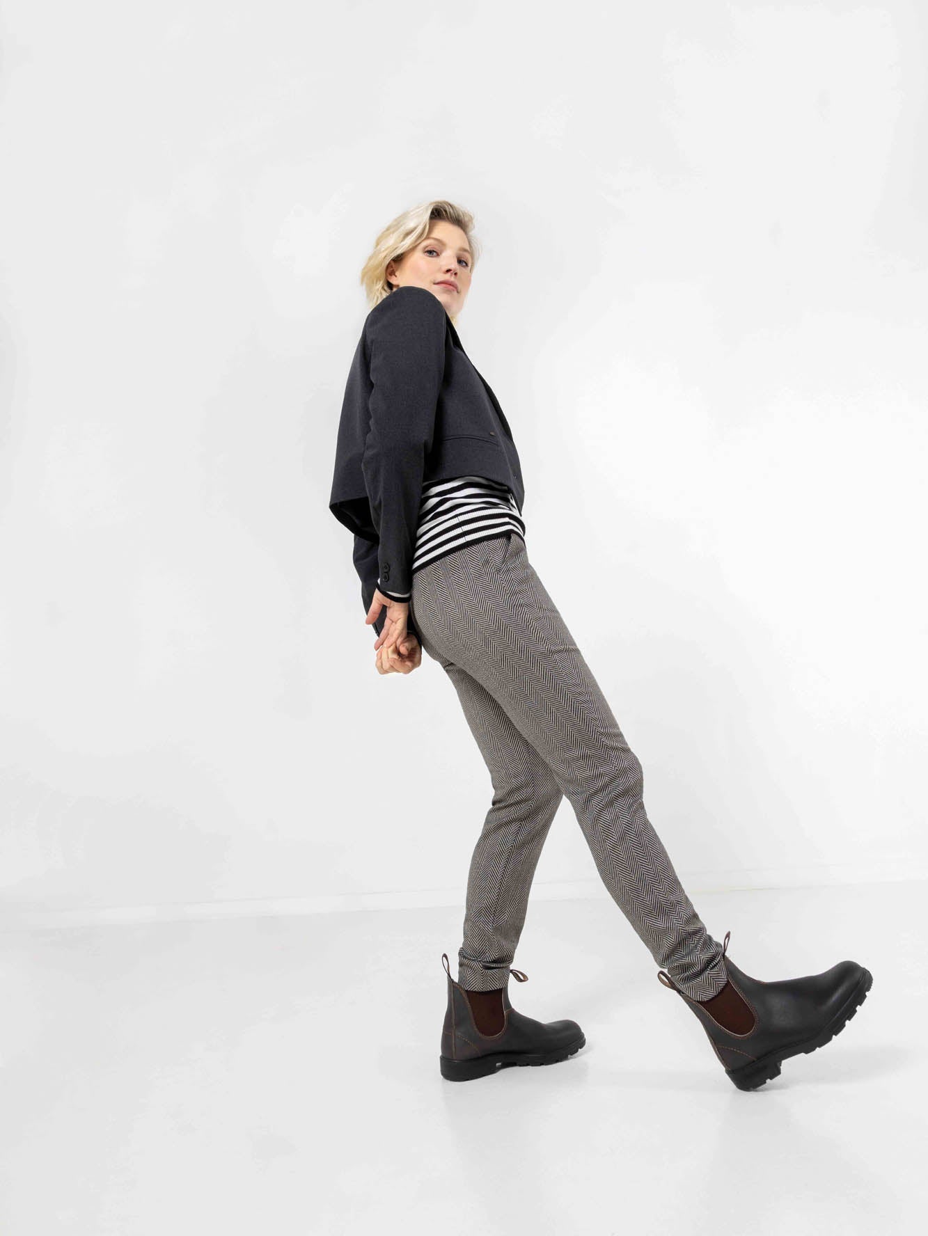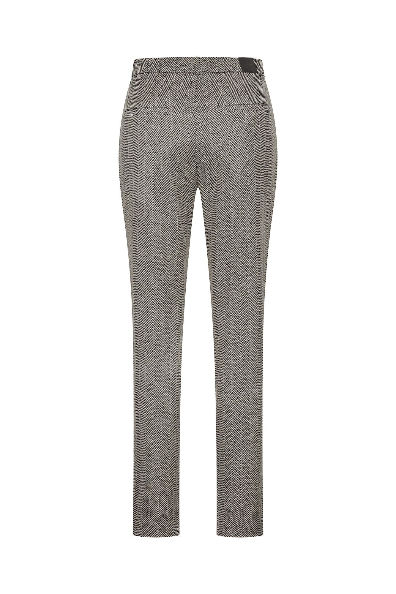 Stijlvolle broek met ‘tapered legs’ in soepele stof met visgraad motief. De broek heeft een ritsje aan de zijkant, elastiek aan de achterkant van de taille en zakken aan de zijkant. De broek is in twee lengtematen verkrijgbaar, R (regular) en S (short).