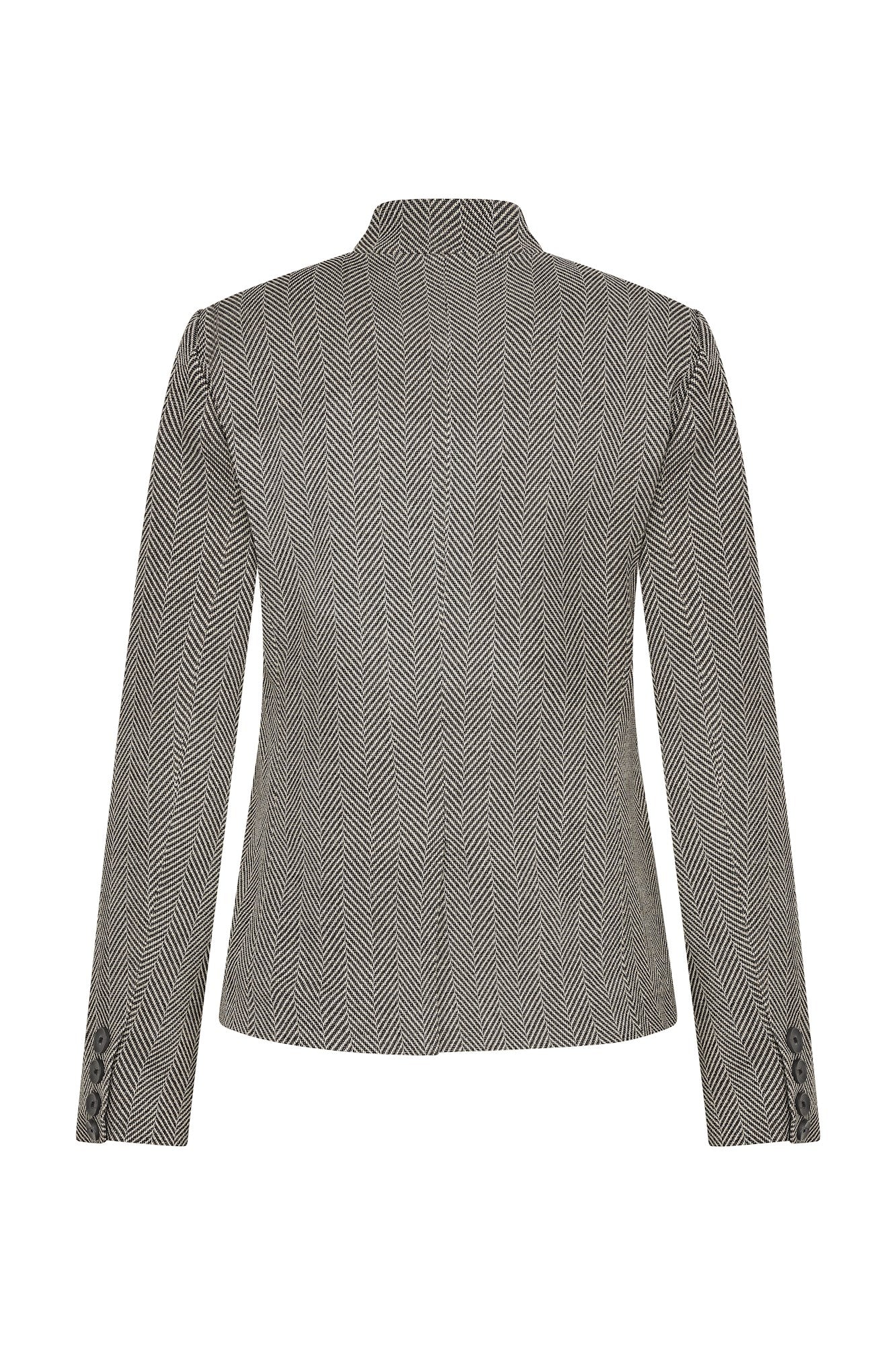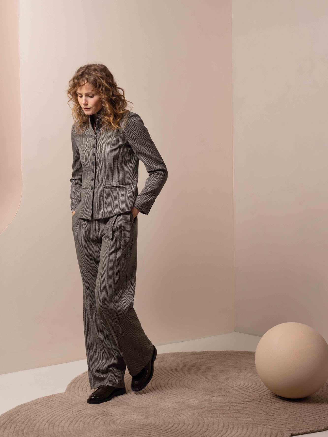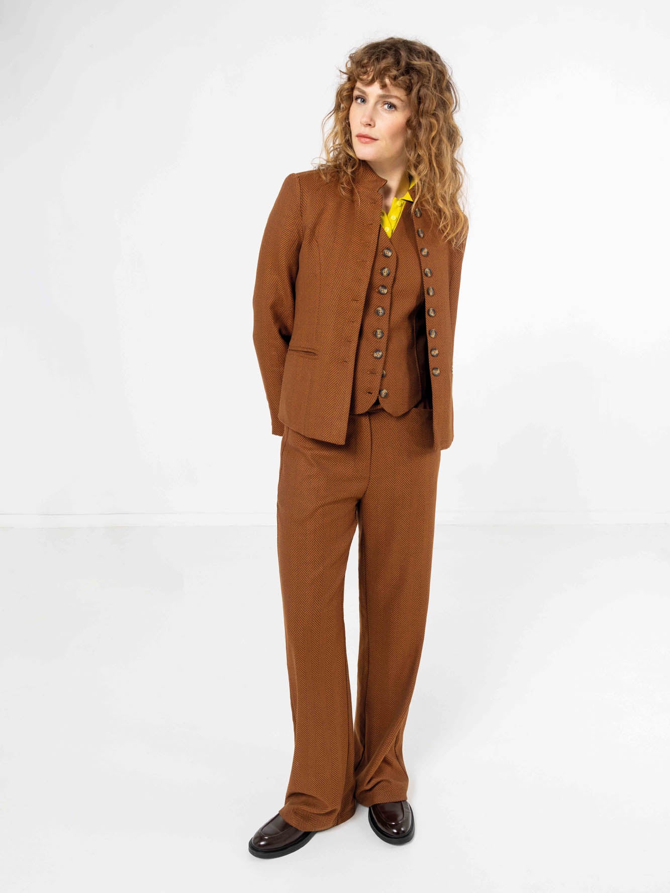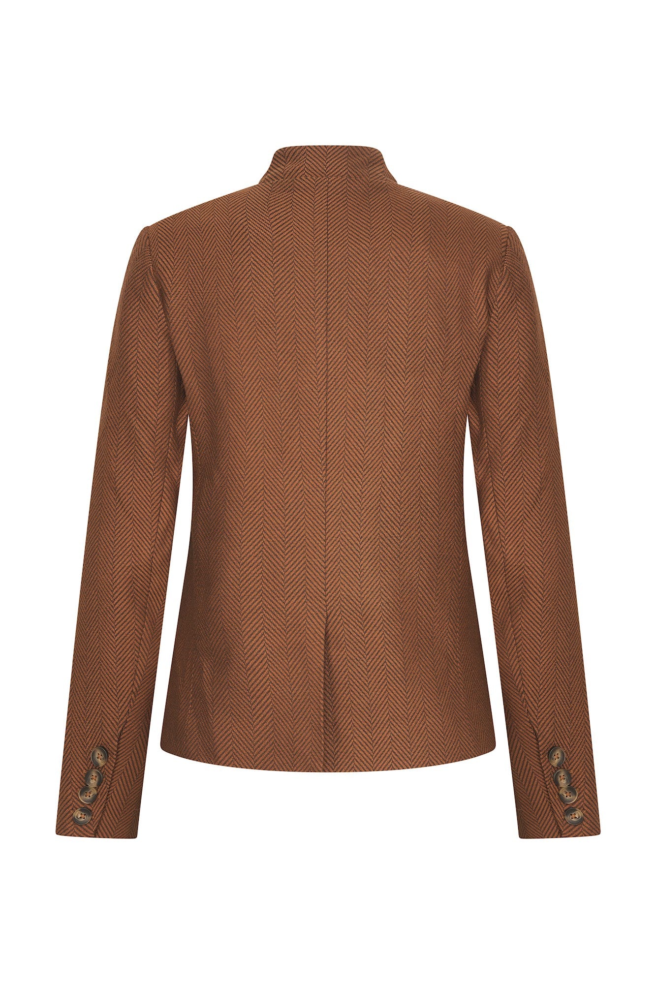 Getailleerd jack met negen knopen en opstaande hals in visgraad motief in mooie najaarskleuren. De blazer heeft een aansluitende pasvorm en twee zakjes aan de voorzijde. Combineer met bijpassende broek en coltrui en je hebt een stijlvolle outfit voor de winter.