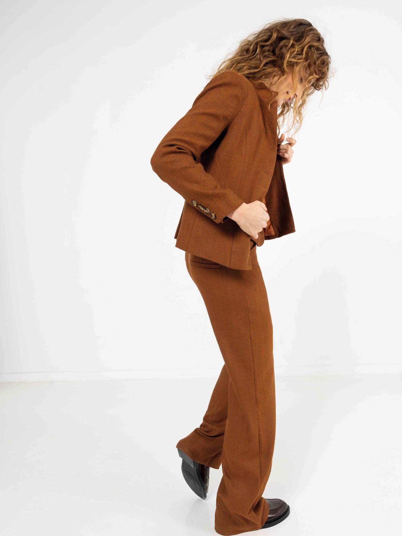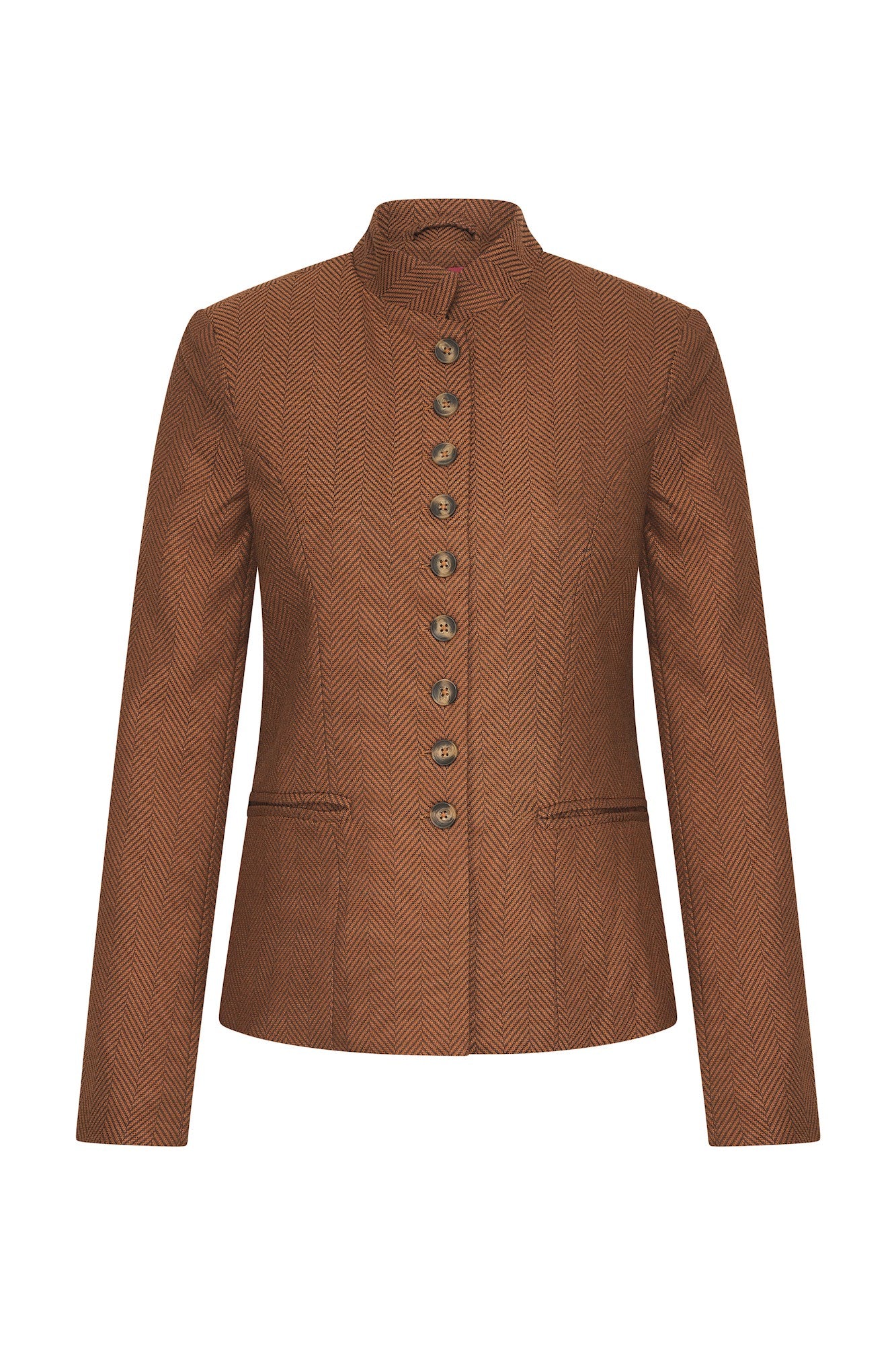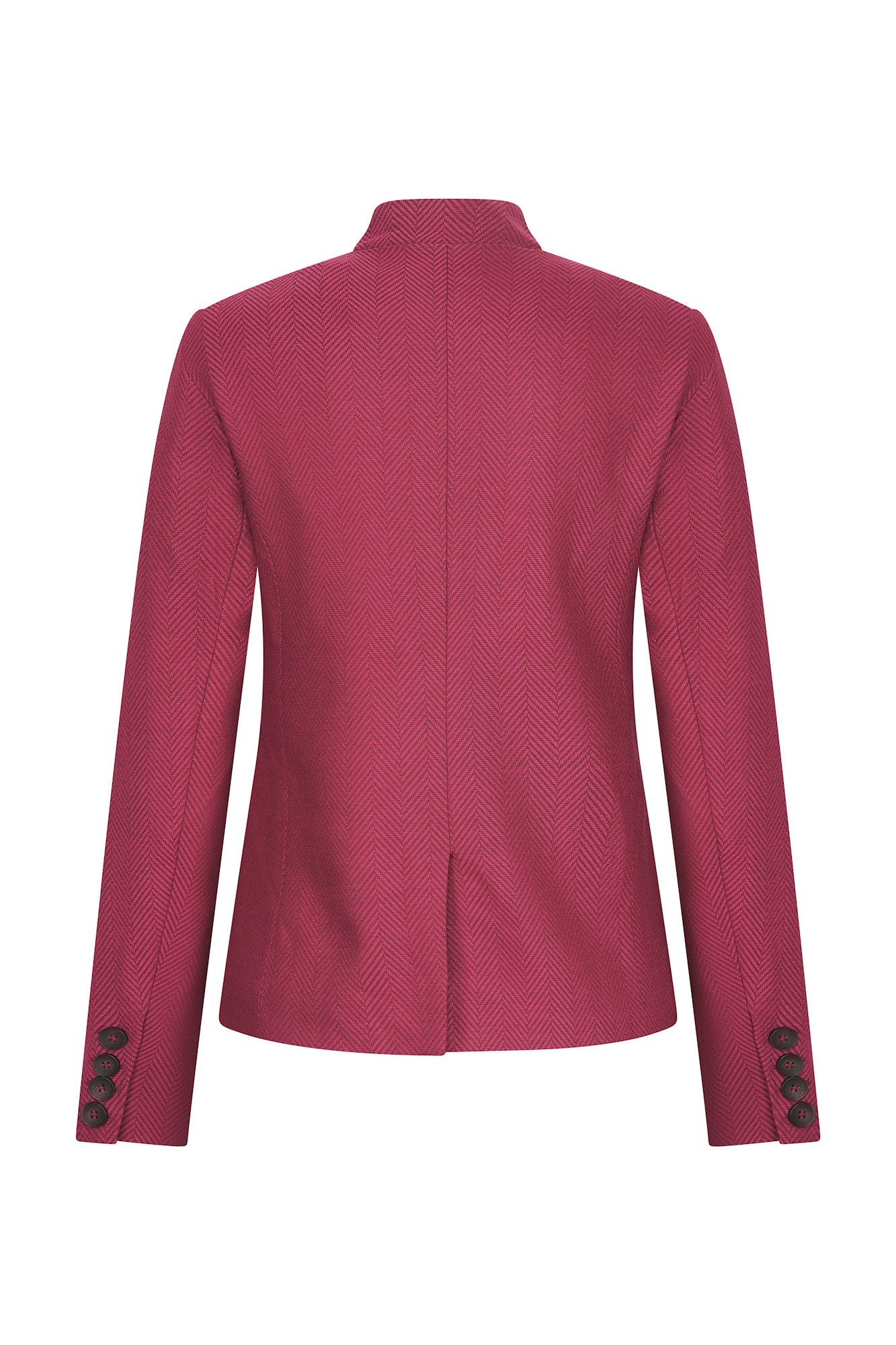 Getailleerd jack met negen knopen en opstaande hals in visgraad motief in mooie najaarskleuren. De blazer heeft een aansluitende pasvorm en twee zakjes aan de voorzijde. Combineer met bijpassende broek en coltrui en je hebt een stijlvolle outfit voor de winter.