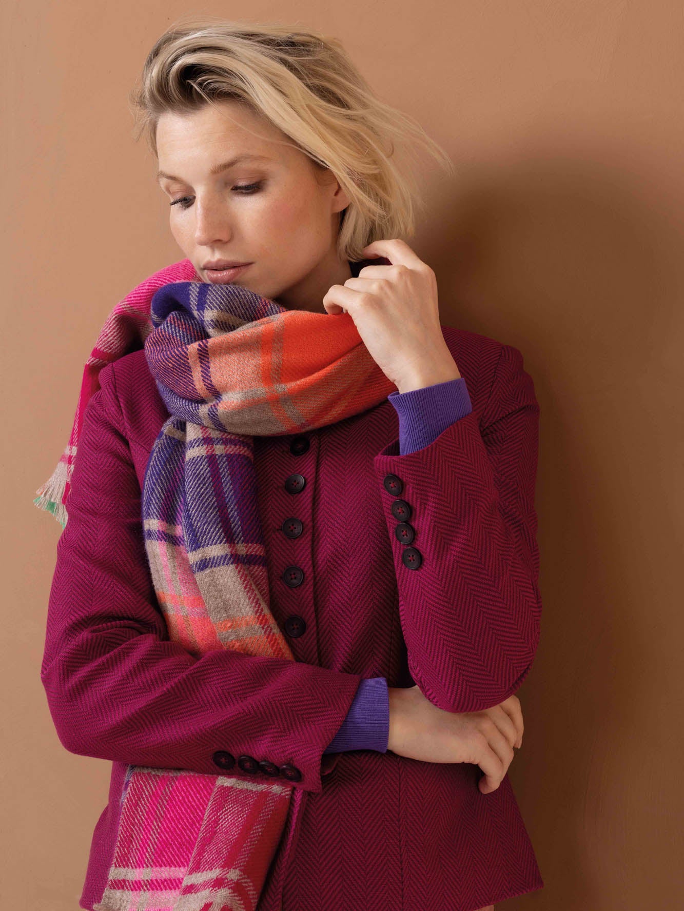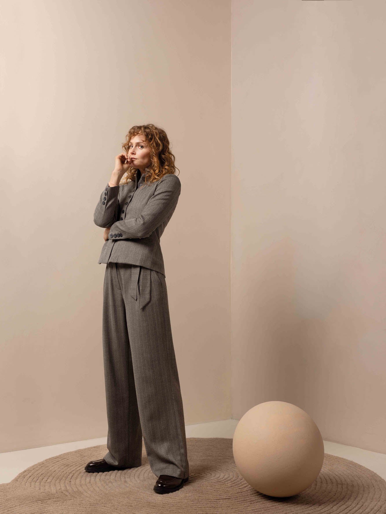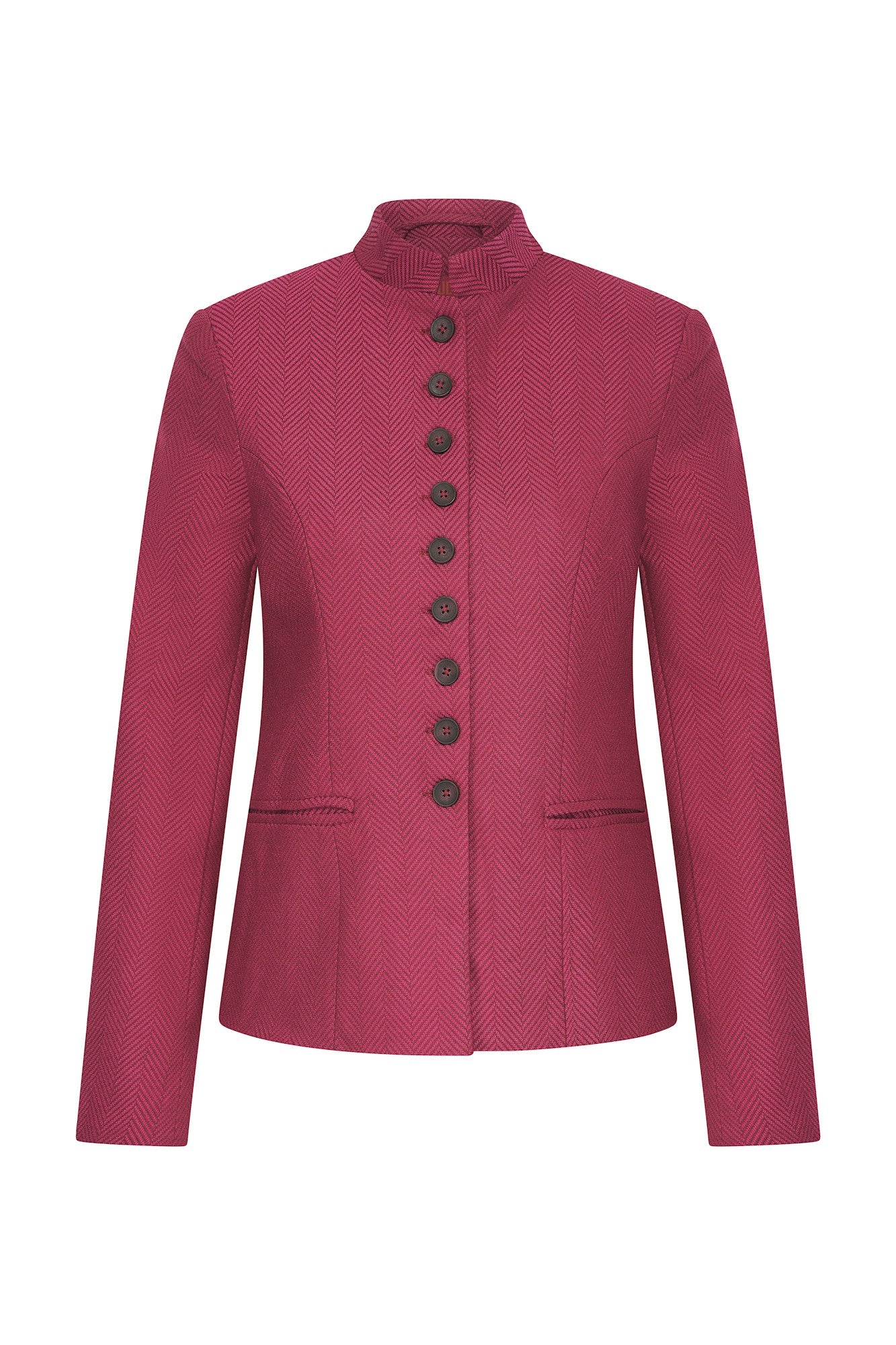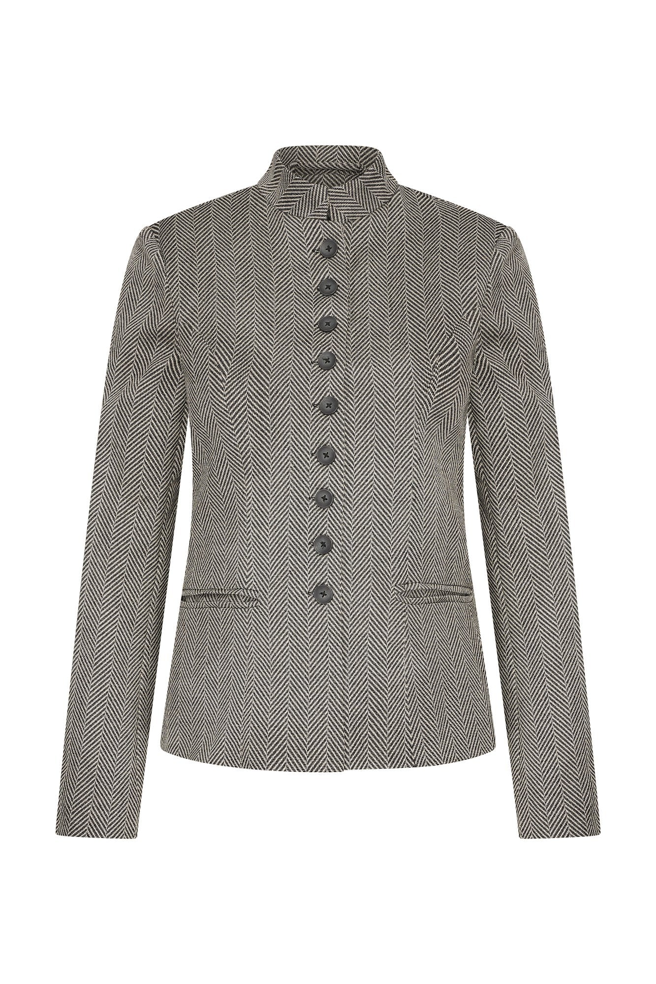 Getailleerd jack met negen knopen en opstaande hals in visgraad motief in mooie najaarskleuren. De blazer heeft een aansluitende pasvorm en twee zakjes aan de voorzijde. Combineer met bijpassende broek en coltrui en je hebt een stijlvolle outfit voor de winter.