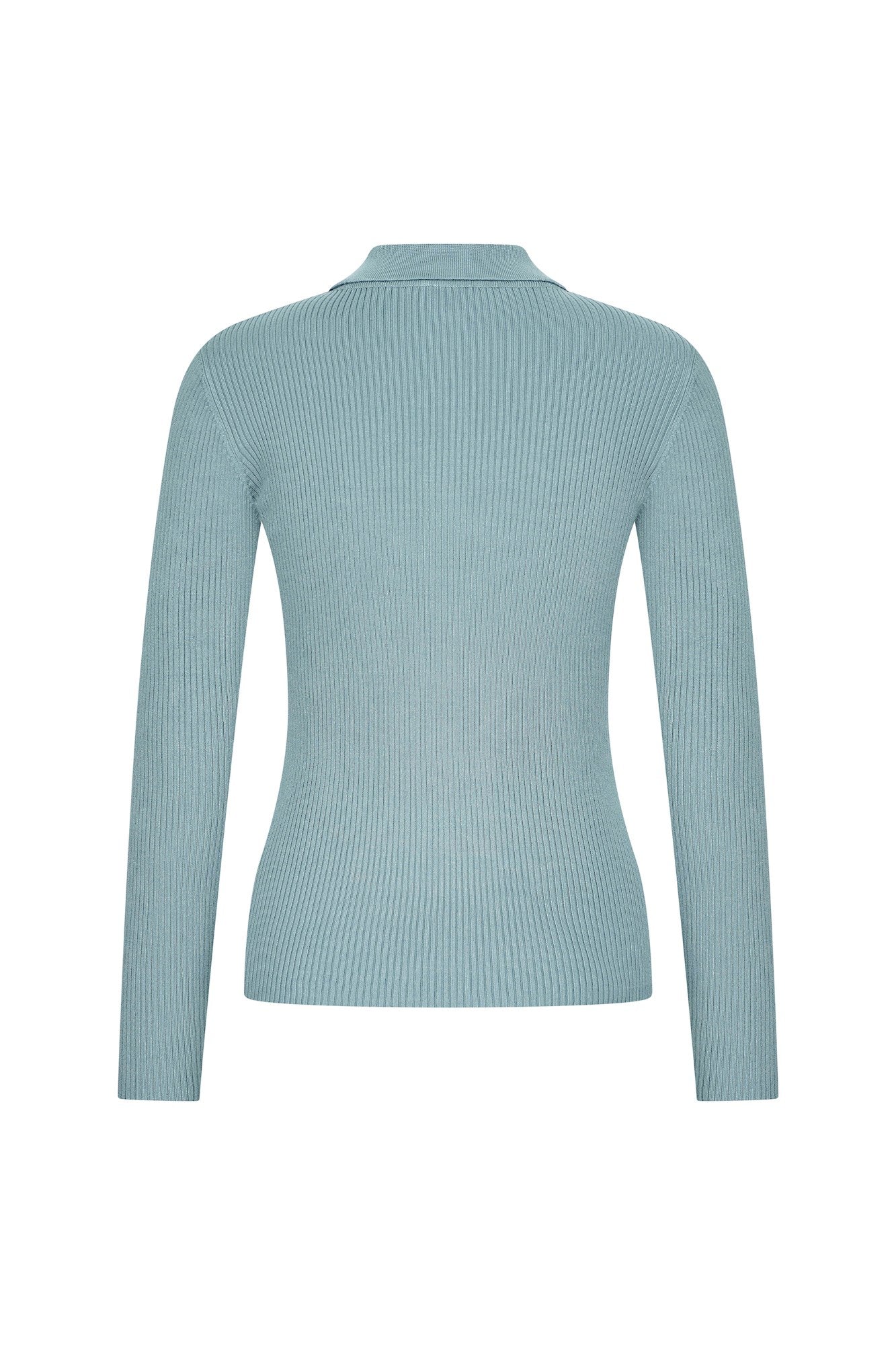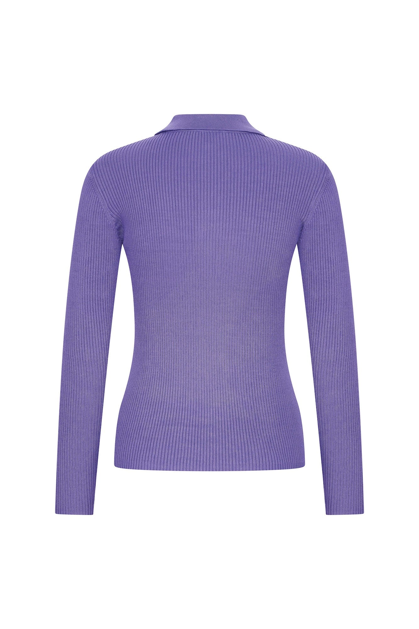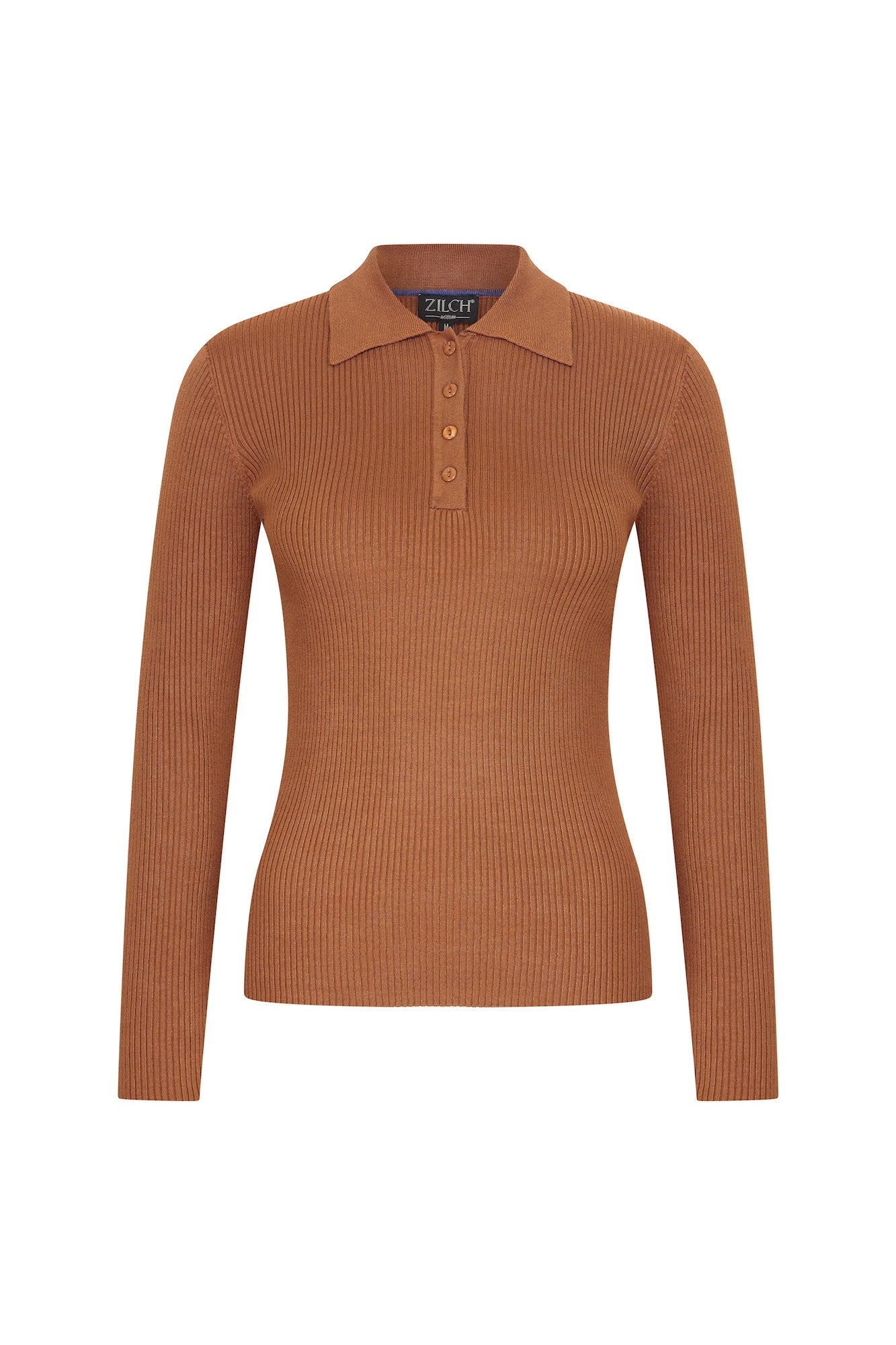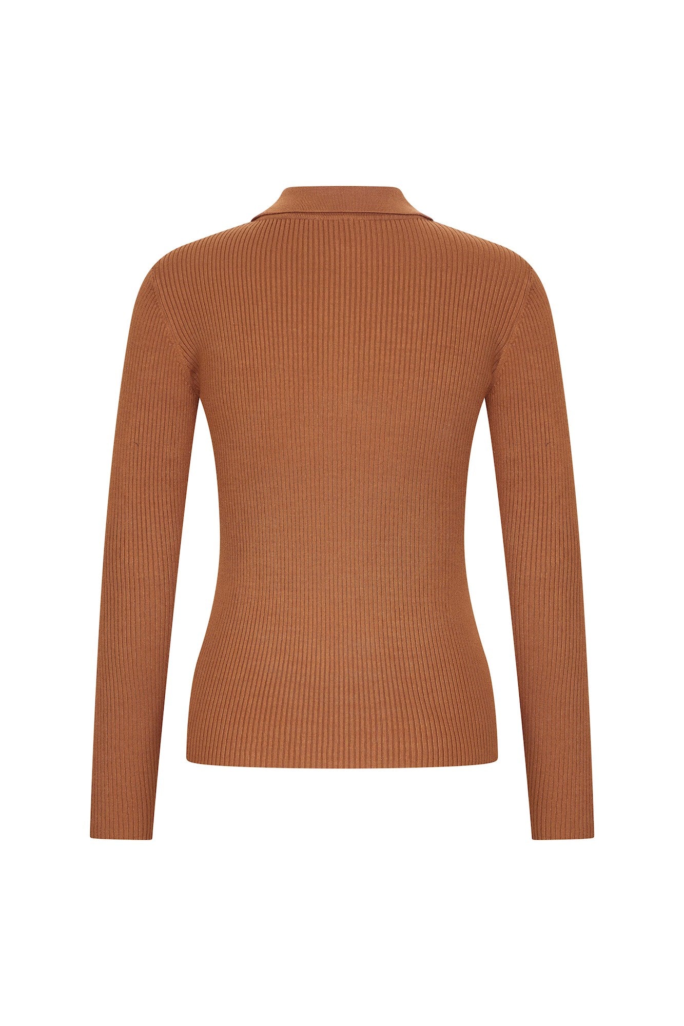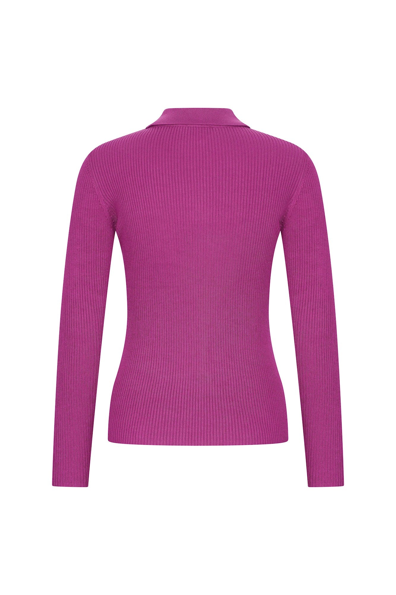 Nauwsluitende, rib gebreide top met polo kraag en knoopsluiting van heerlijk zachte bamboe viscose in prachtige najaarskleuren. De top heeft lange mouwen en combineert uitstekend met een geprinte rok of broek.