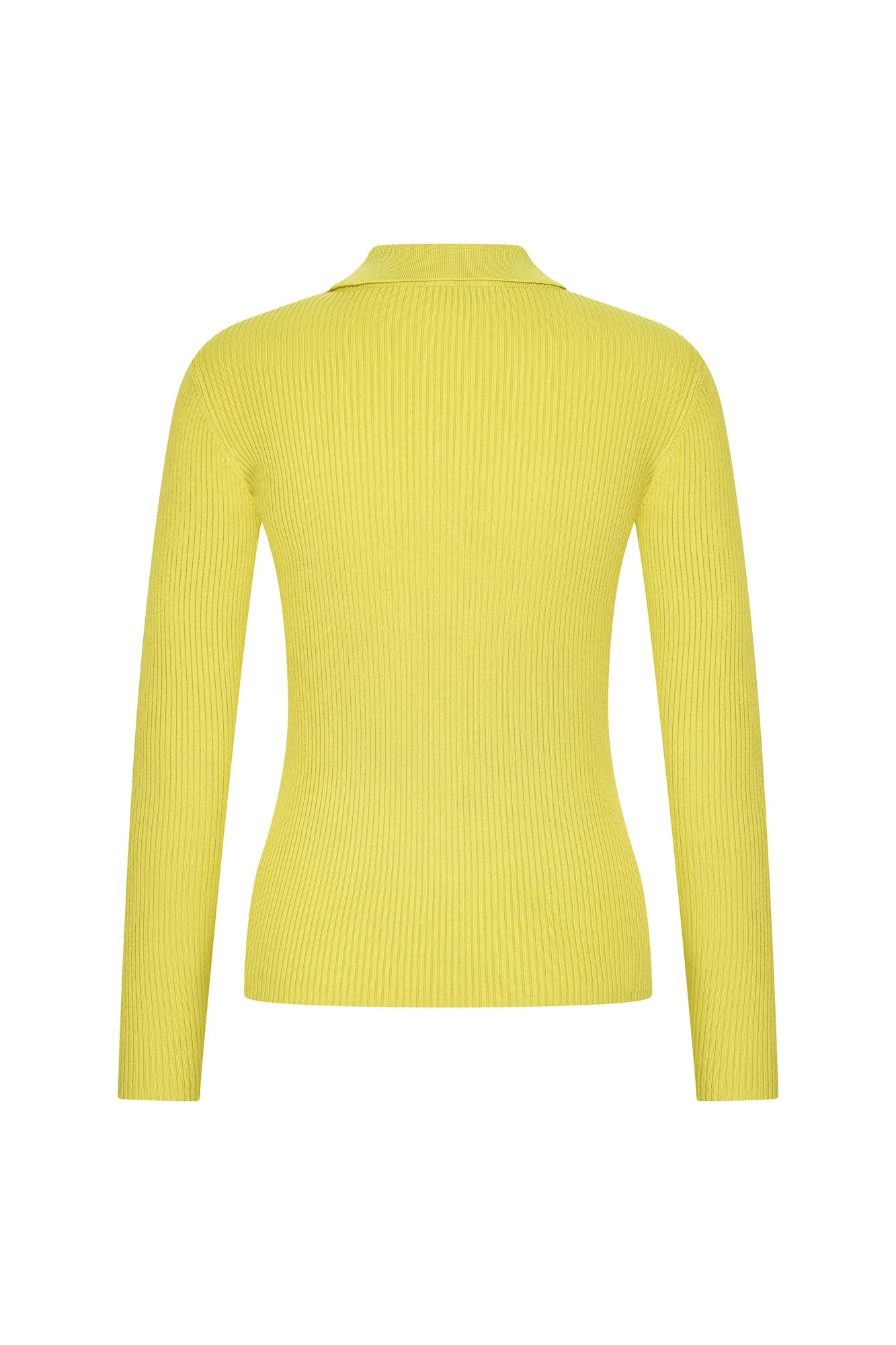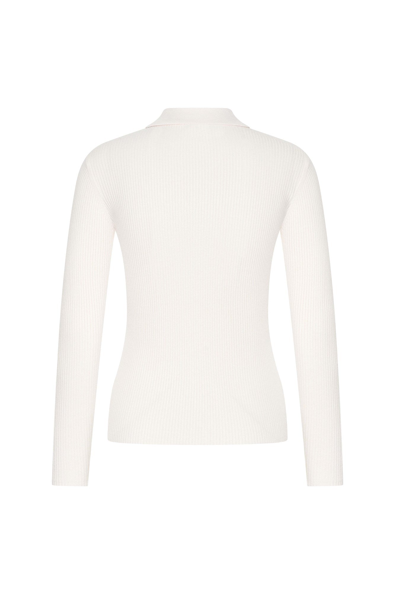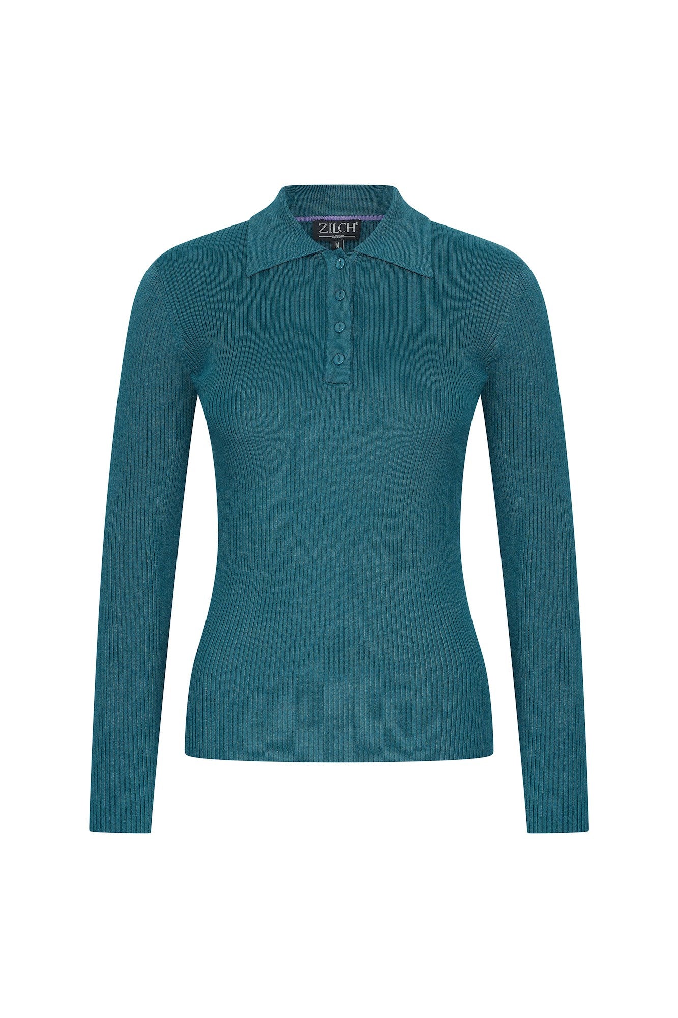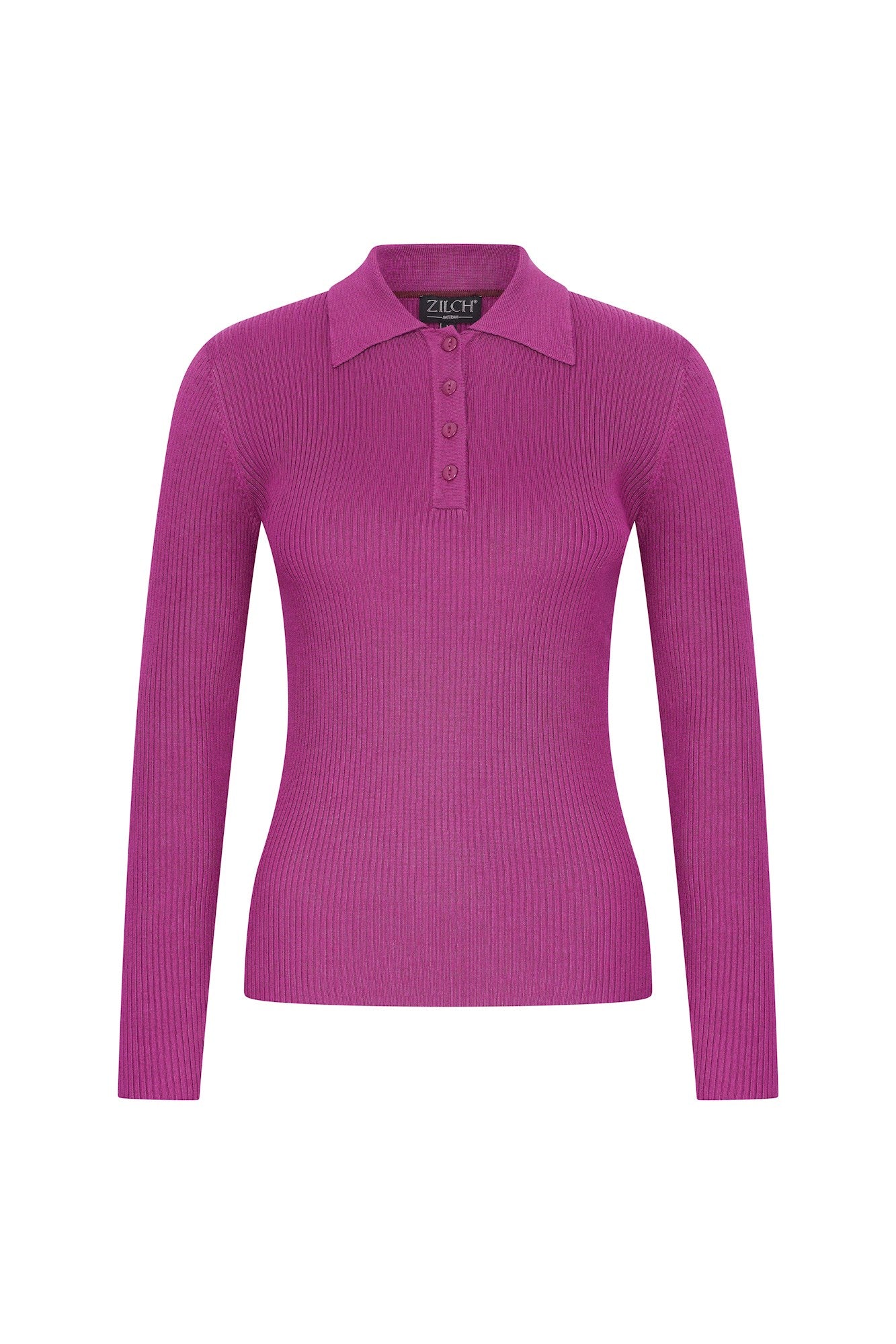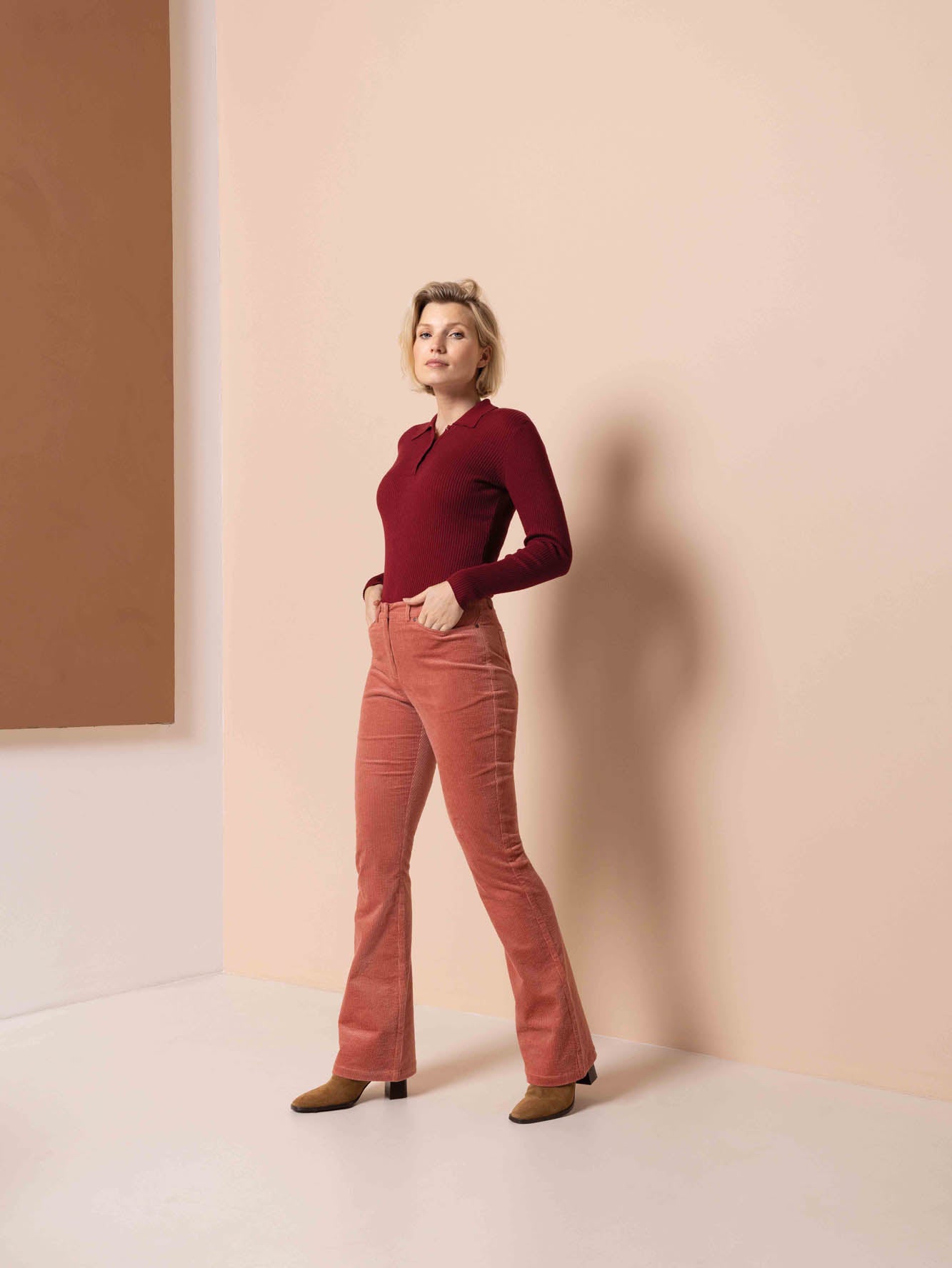 Nauwsluitende, rib gebreide top met polo kraag en knoopsluiting van heerlijk zachte bamboe viscose in prachtige najaarskleuren. De top heeft lange mouwen en combineert uitstekend met een geprinte rok of broek.
