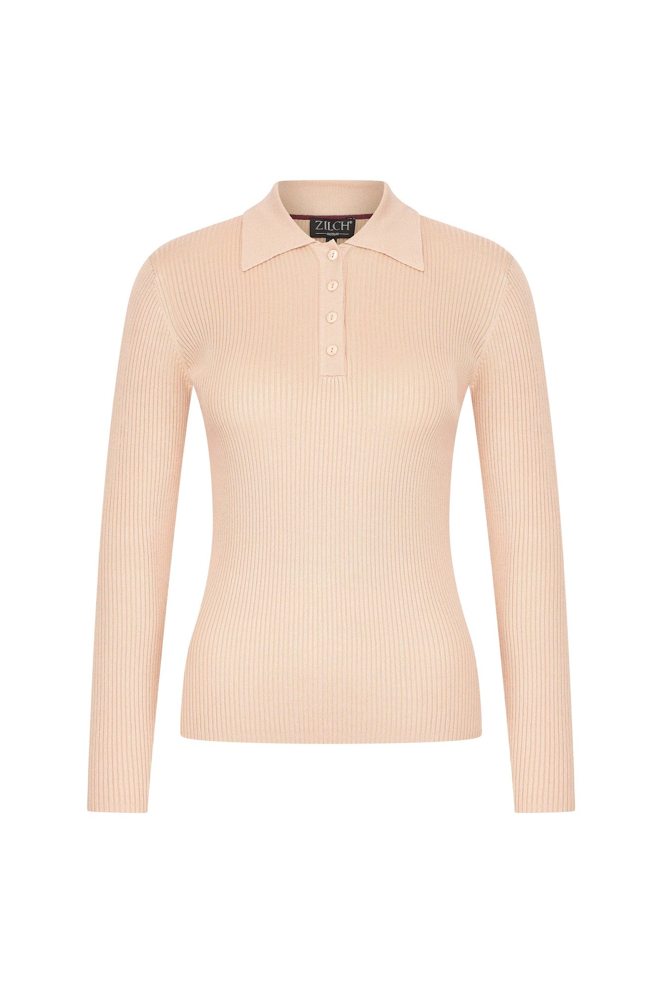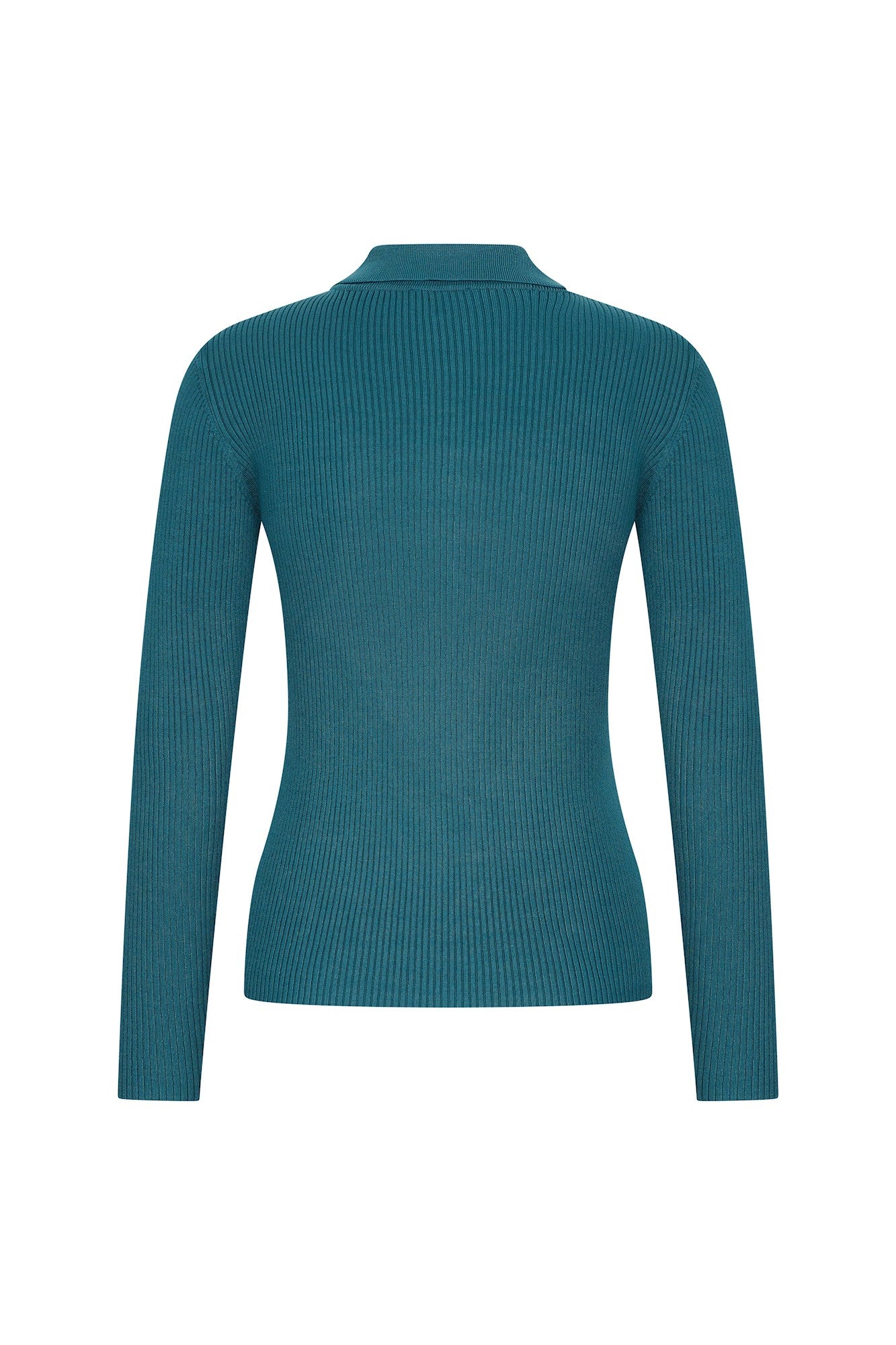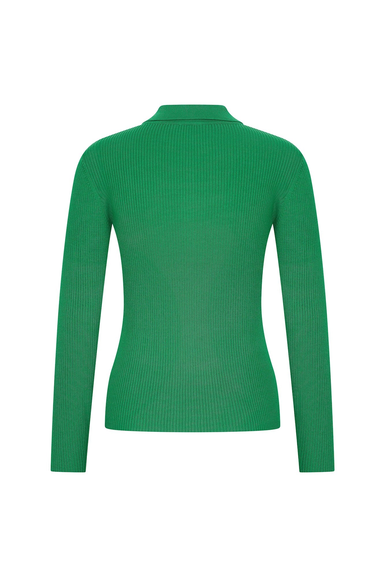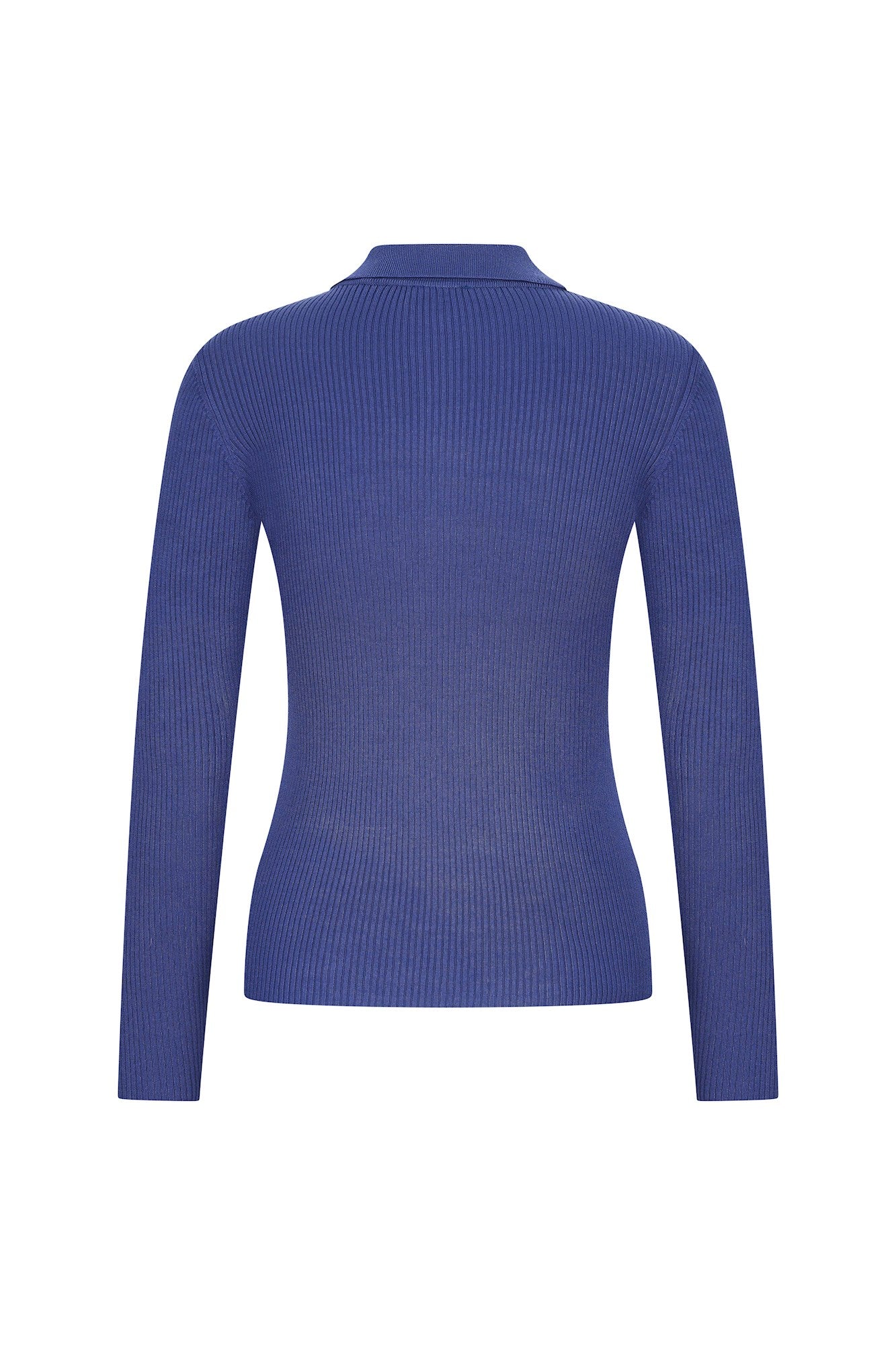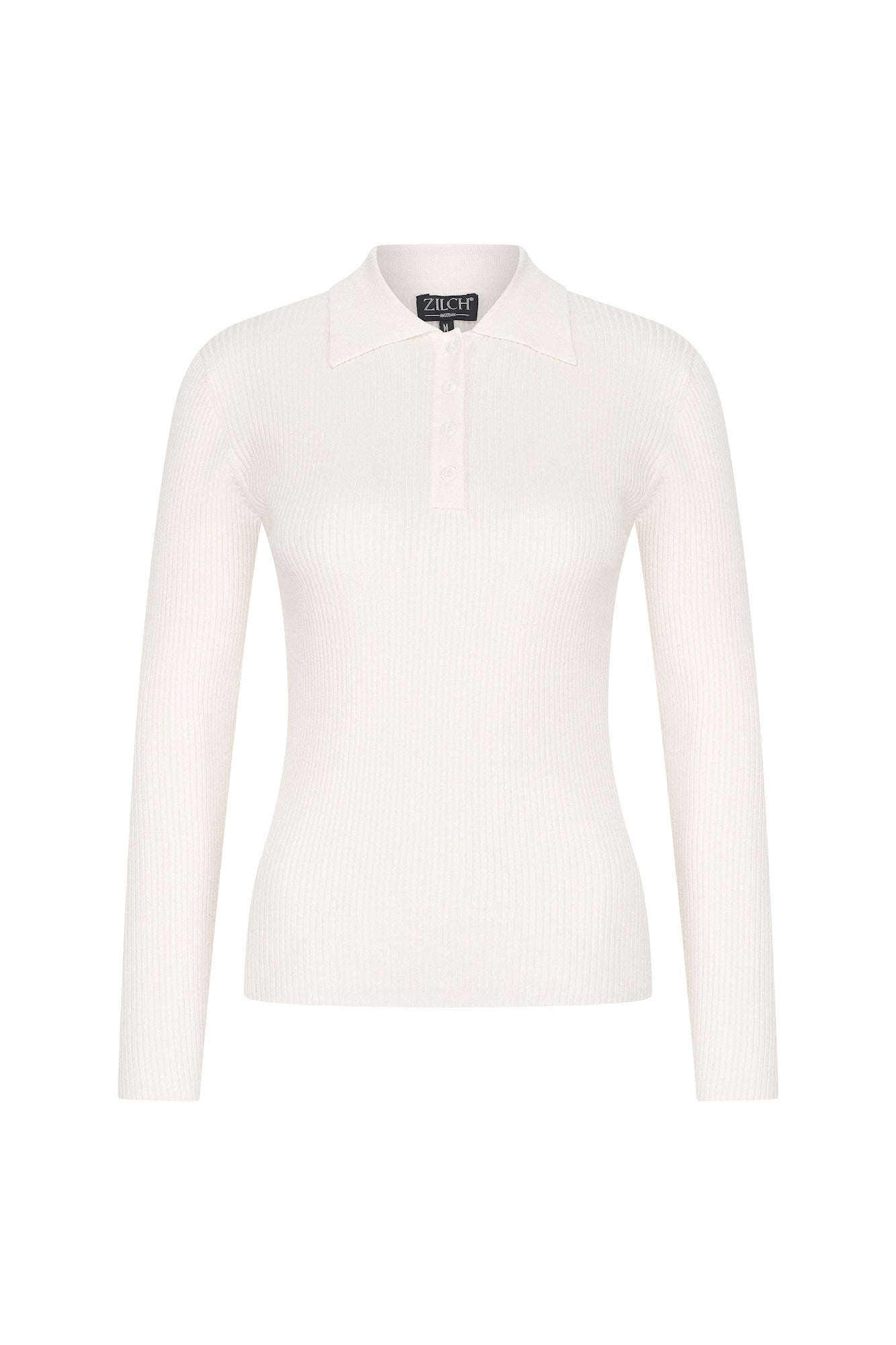 Nauwsluitende, rib gebreide top met polo kraag en knoopsluiting van heerlijk zachte bamboe viscose in prachtige najaarskleuren. De top heeft lange mouwen en combineert uitstekend met een geprinte rok of broek.