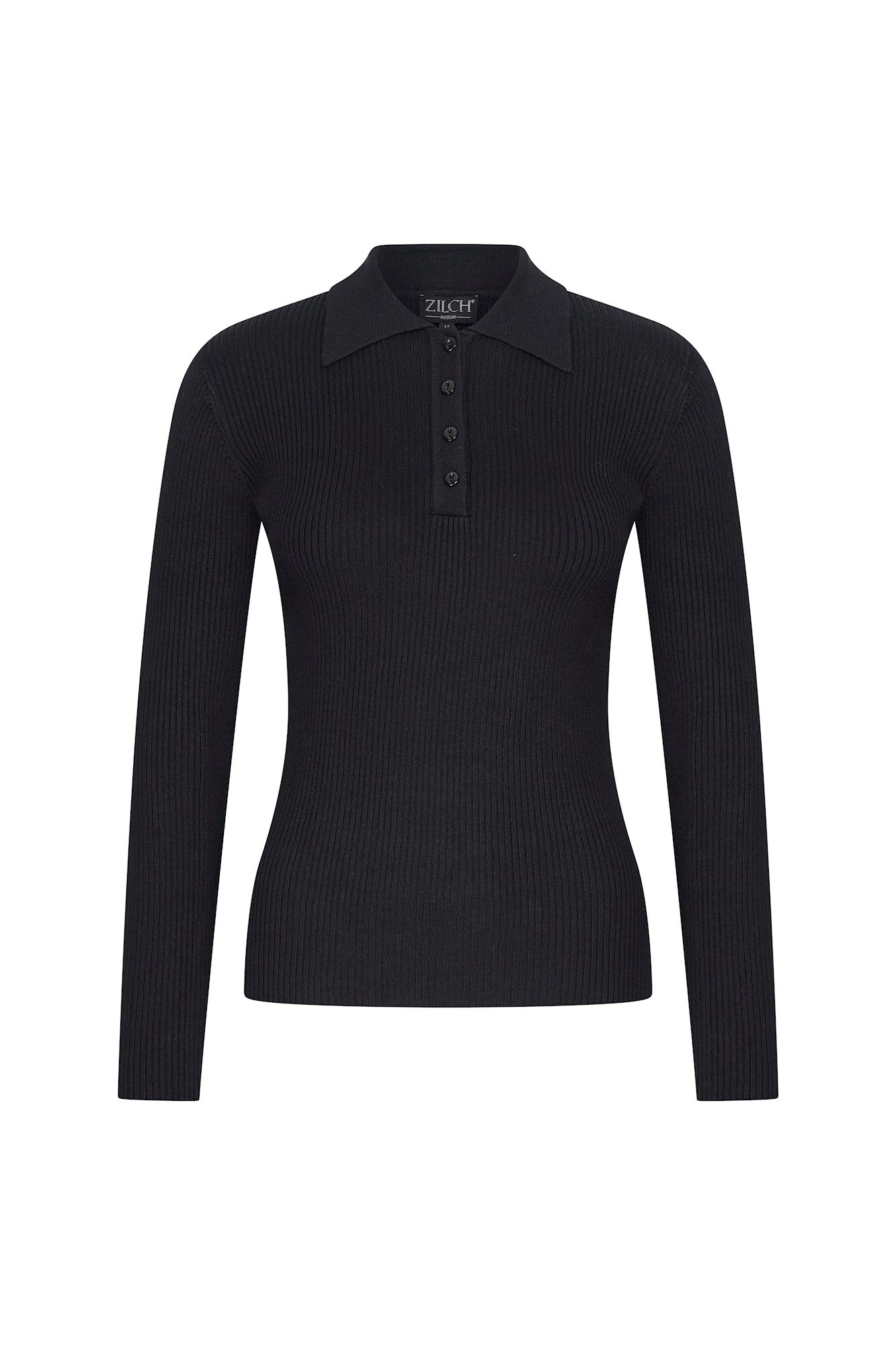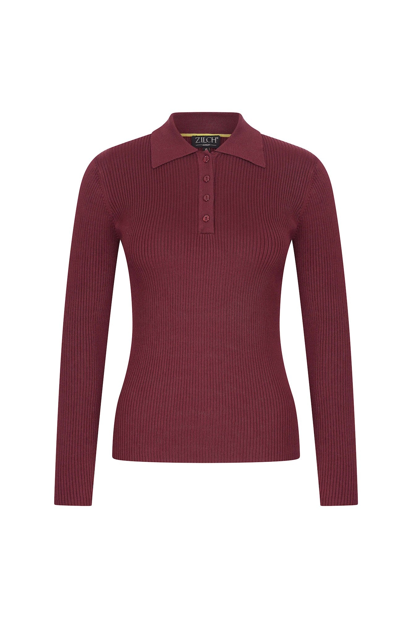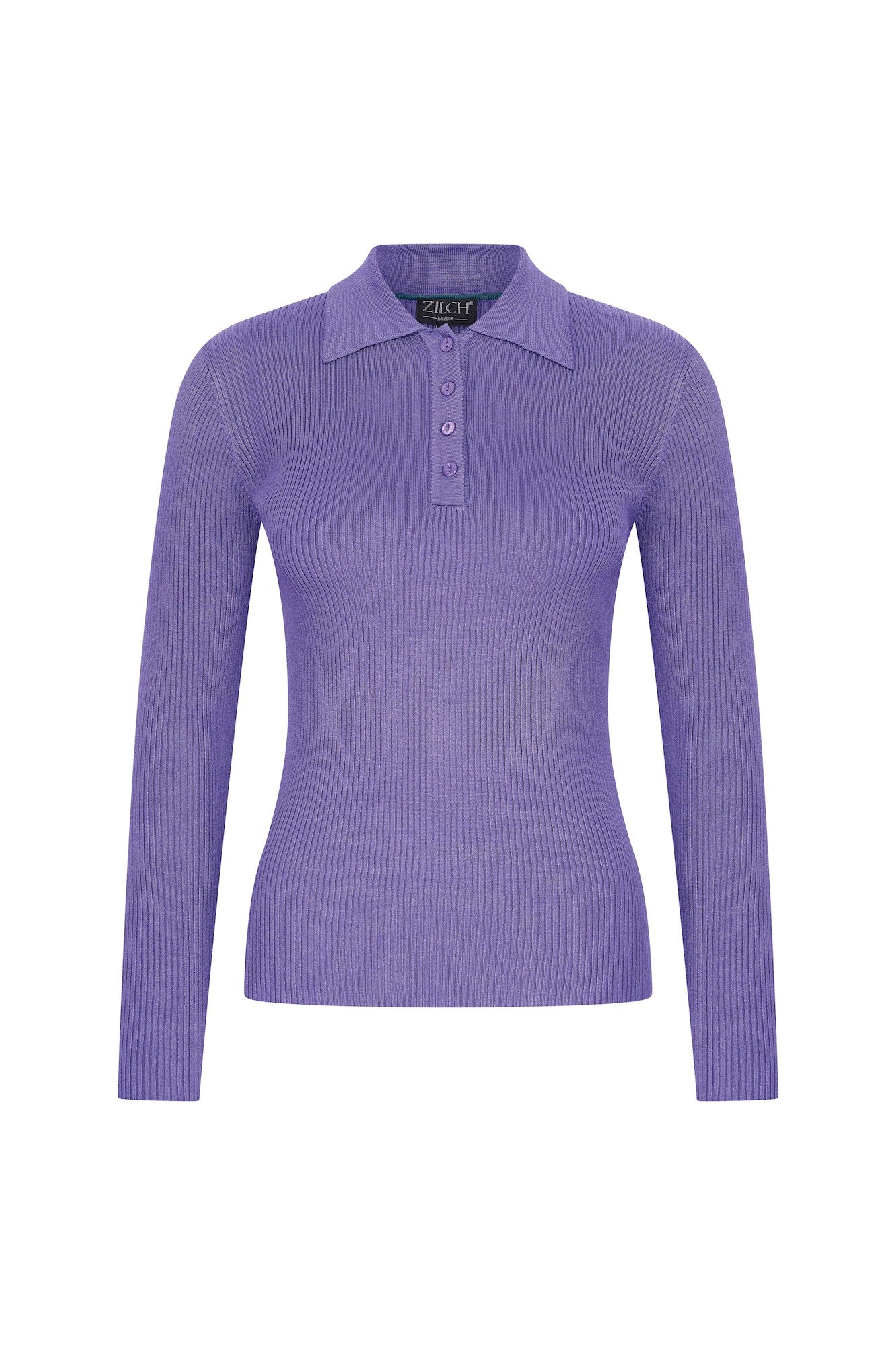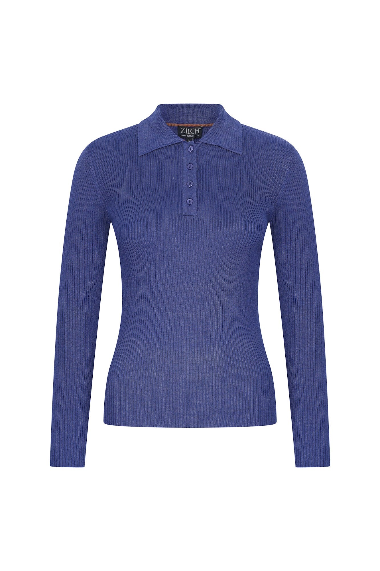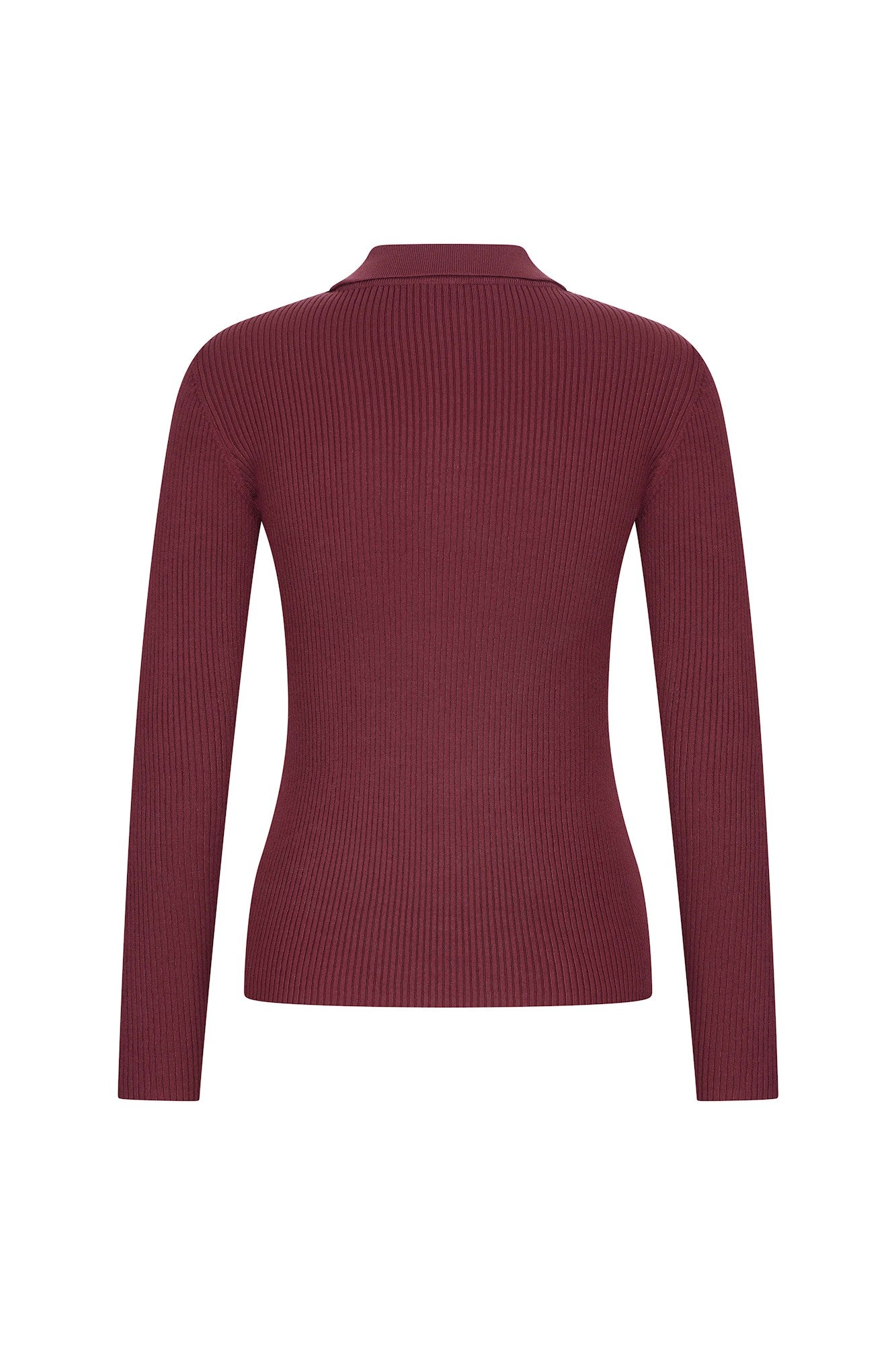 Nauwsluitende, rib gebreide top met polo kraag en knoopsluiting van heerlijk zachte bamboe viscose in prachtige najaarskleuren. De top heeft lange mouwen en combineert uitstekend met een geprinte rok of broek.