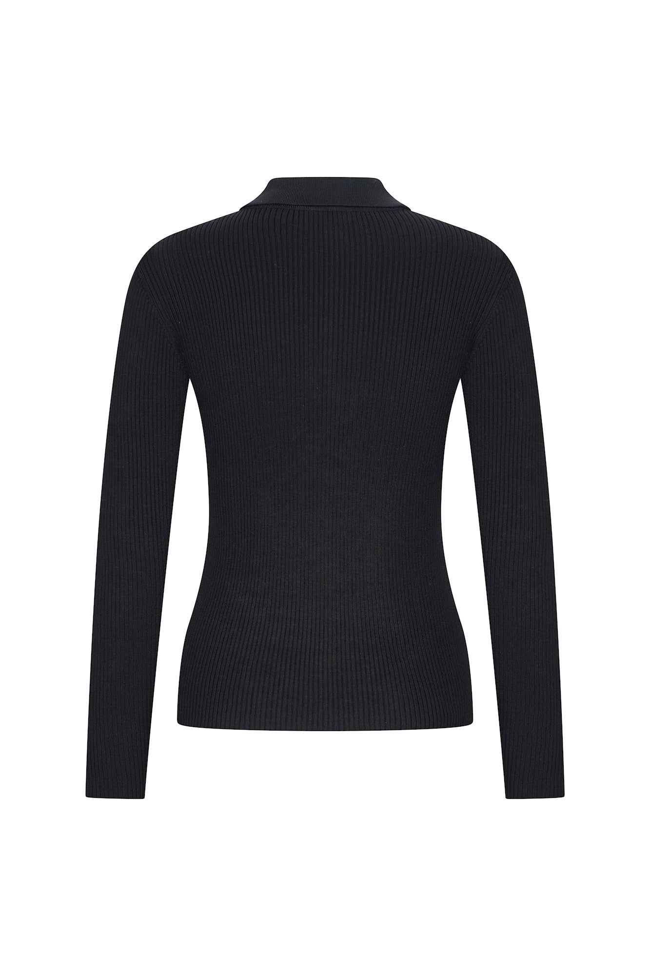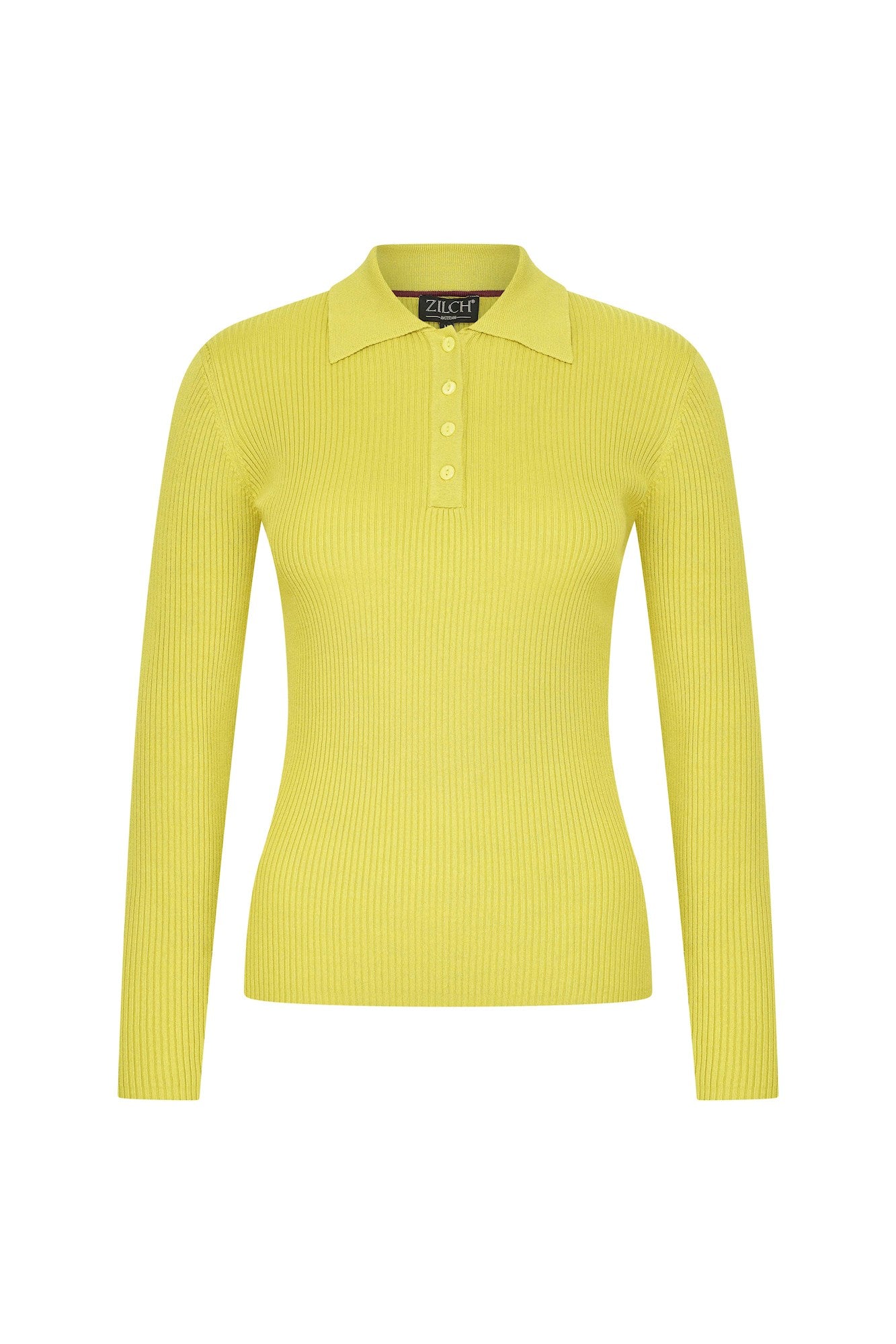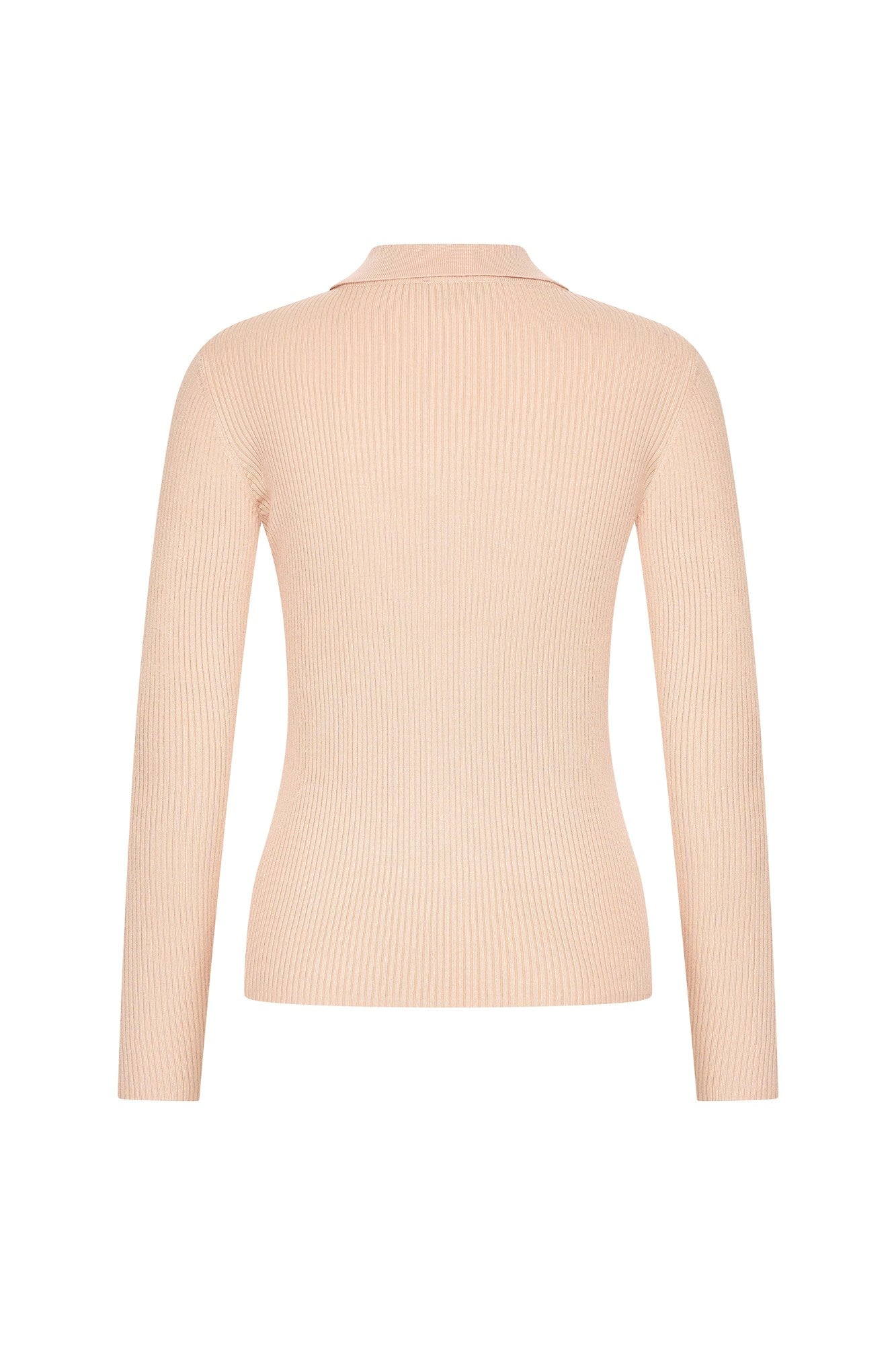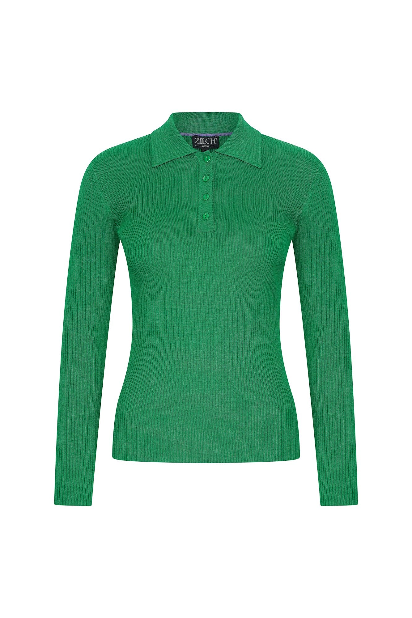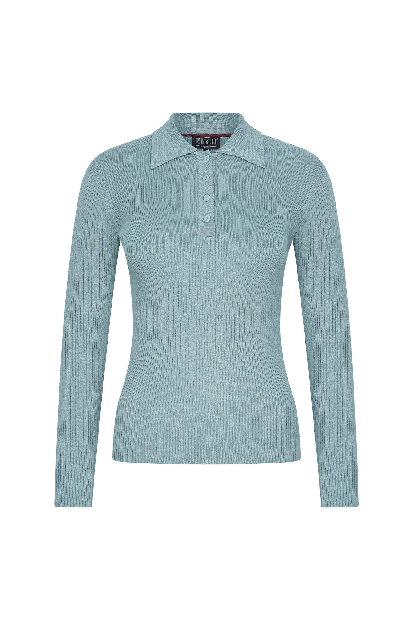 Nauwsluitende, rib gebreide top met polo kraag en knoopsluiting van heerlijk zachte bamboe viscose in prachtige najaarskleuren. De top heeft lange mouwen en combineert uitstekend met een geprinte rok of broek.