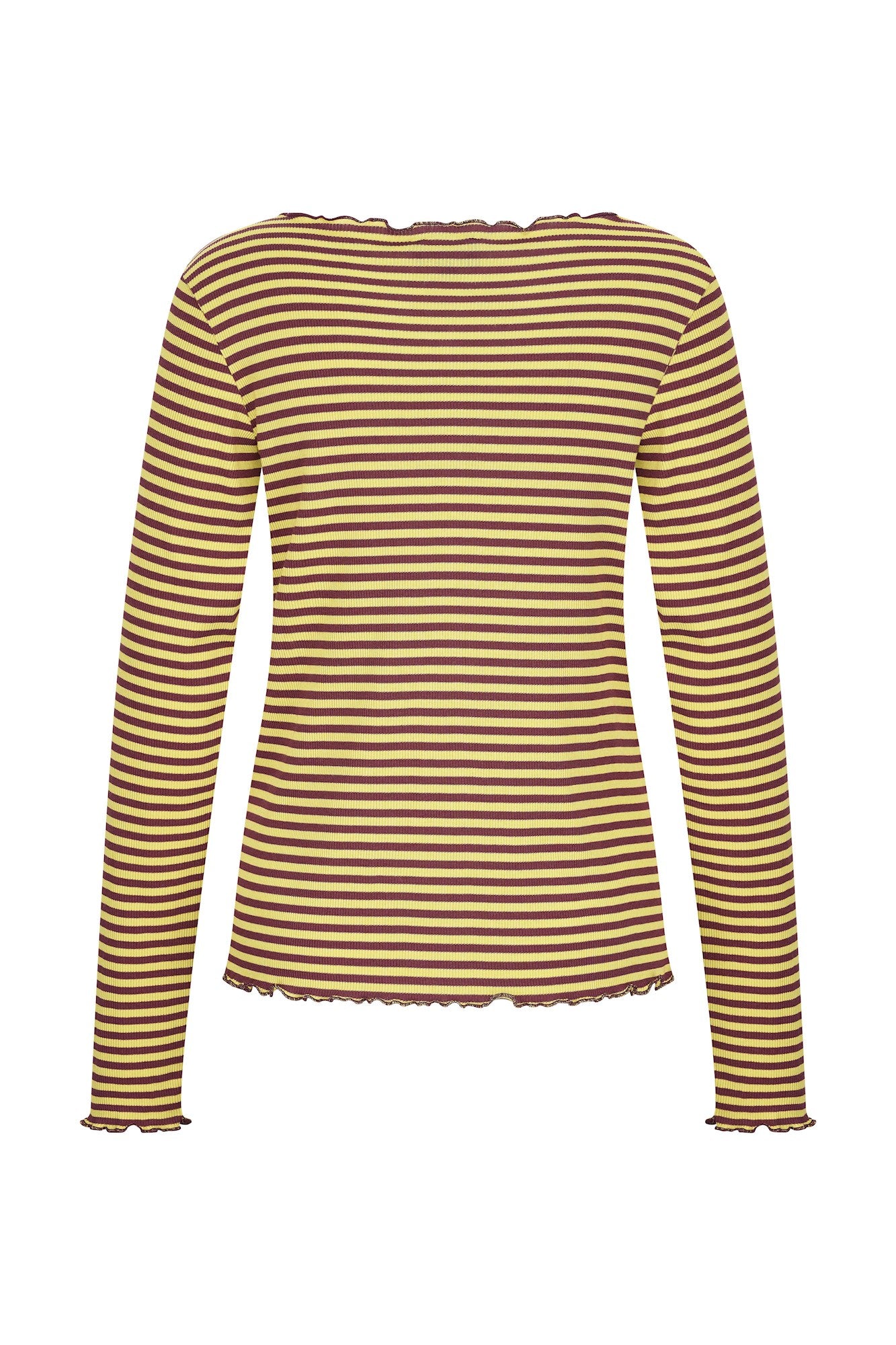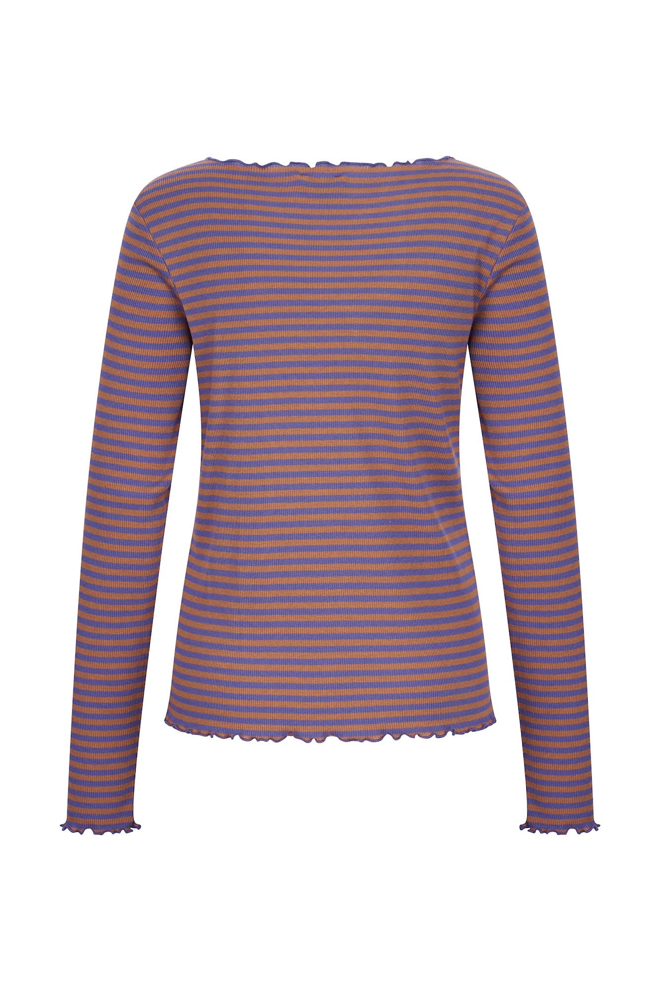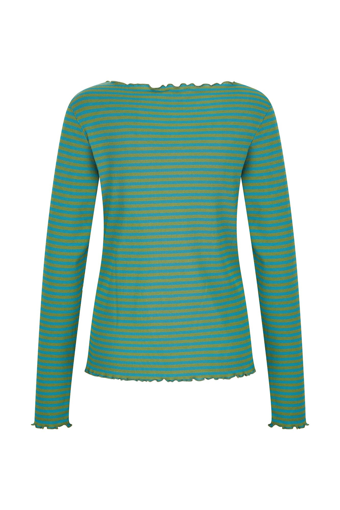 Heerlijke zachte top van katoen-zijde mix in een fijn gebreid gestreept patroon. De top heeft een brede ronde hals en de mouwen, halslijn en onderzijde zijn allen afgewerkt met en ruffle rand. Een speelse top, fijn om te dragen als laagje wat gezien mag worden onder een trui, jurk of vestje.