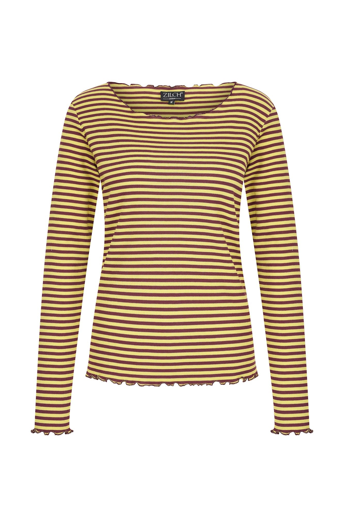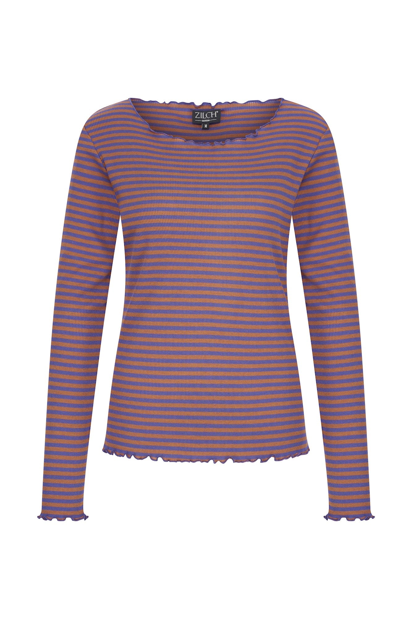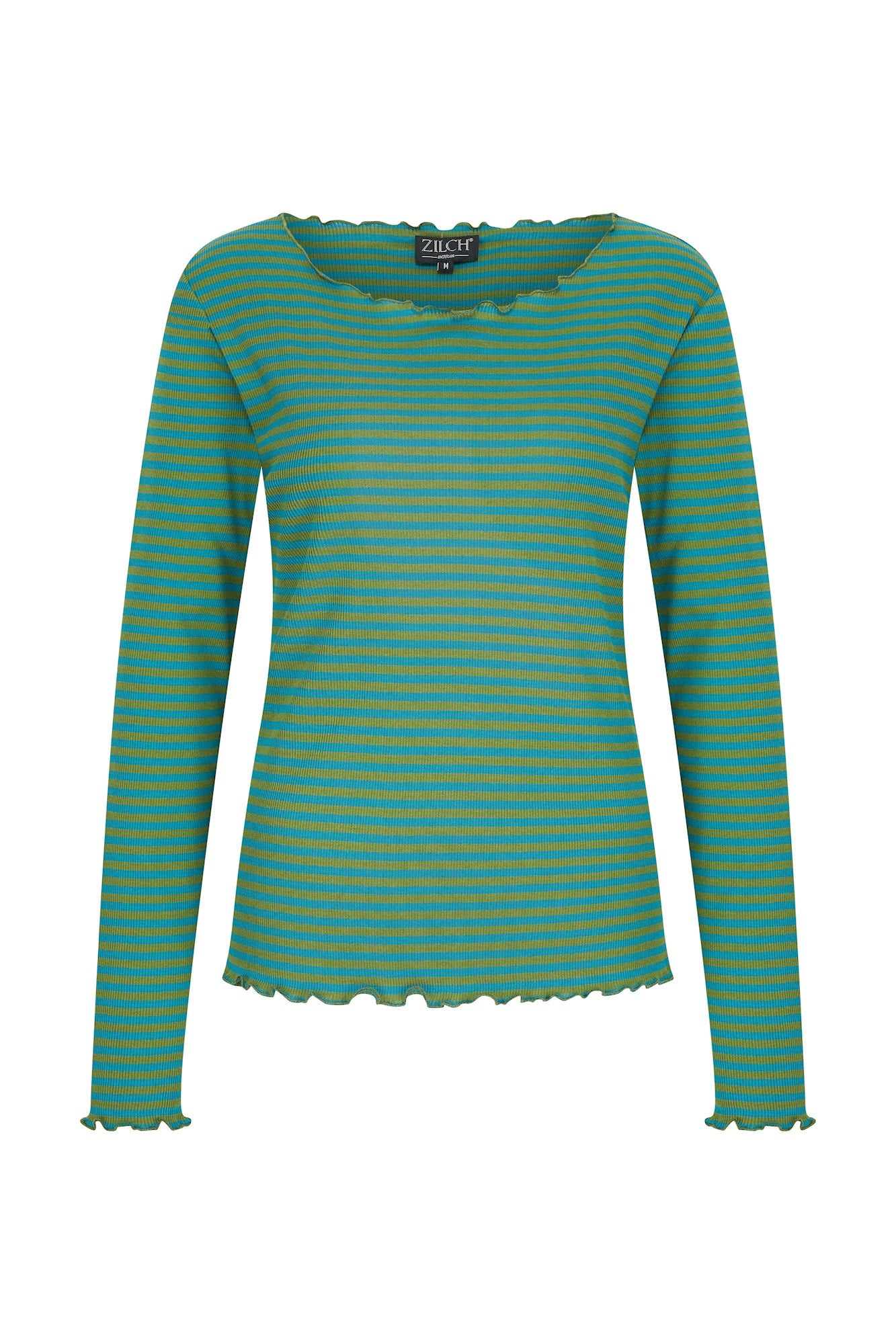 Heerlijke zachte top van katoen-zijde mix in een fijn gebreid gestreept patroon. De top heeft een brede ronde hals en de mouwen, halslijn en onderzijde zijn allen afgewerkt met en ruffle rand. Een speelse top, fijn om te dragen als laagje wat gezien mag worden onder een trui, jurk of vestje.