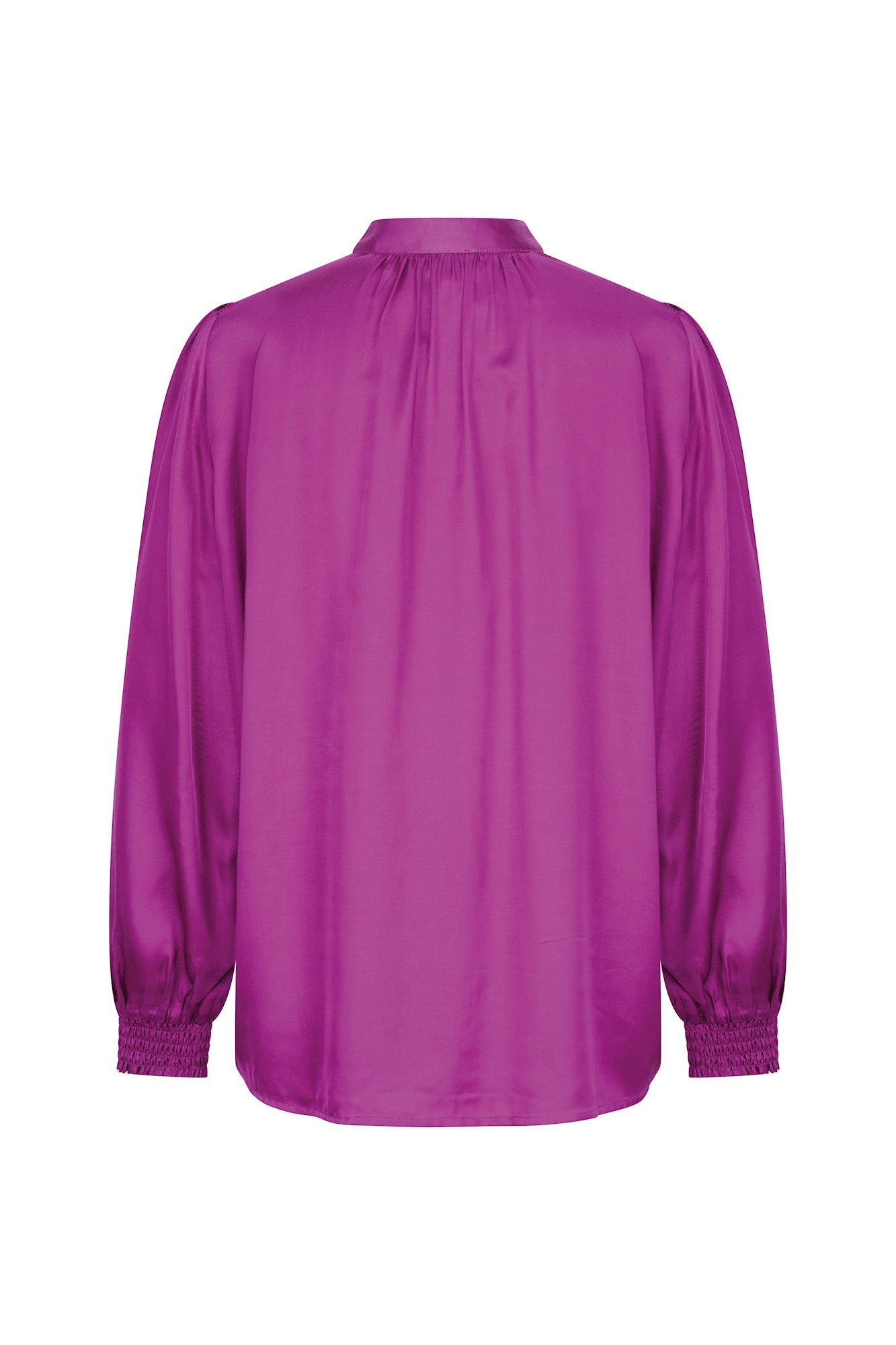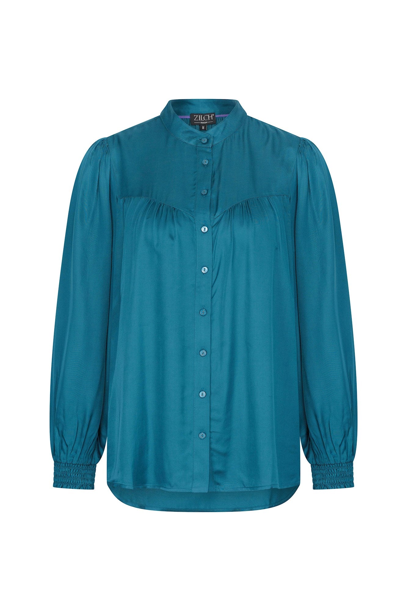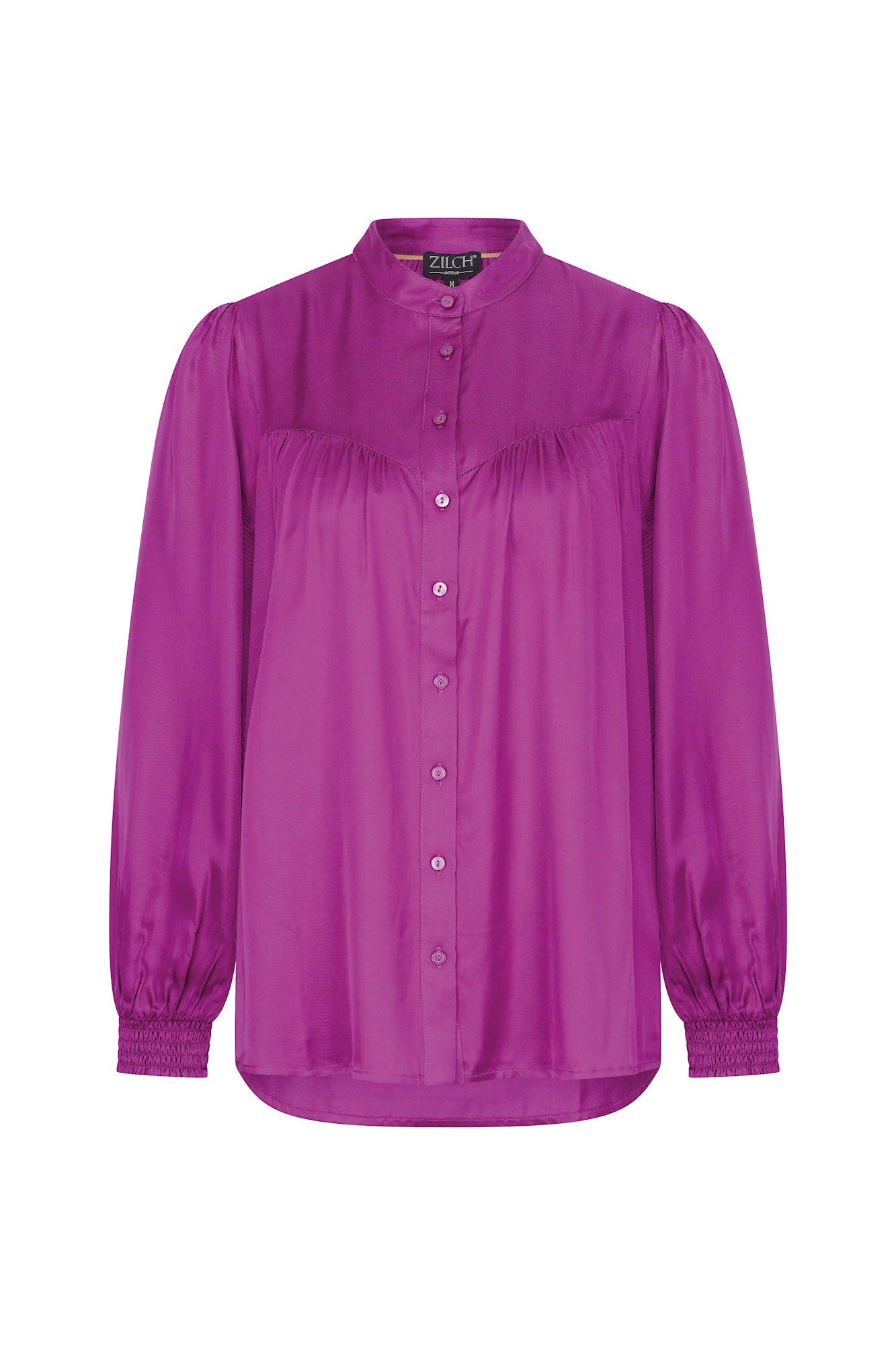 Feestelijke satijnen blouse met knoopsluiting en korte opstaande kraag in prachtige kleuren. Dit losser vallende model heeft geplooide wijde mouwen met gesmokt manchet.