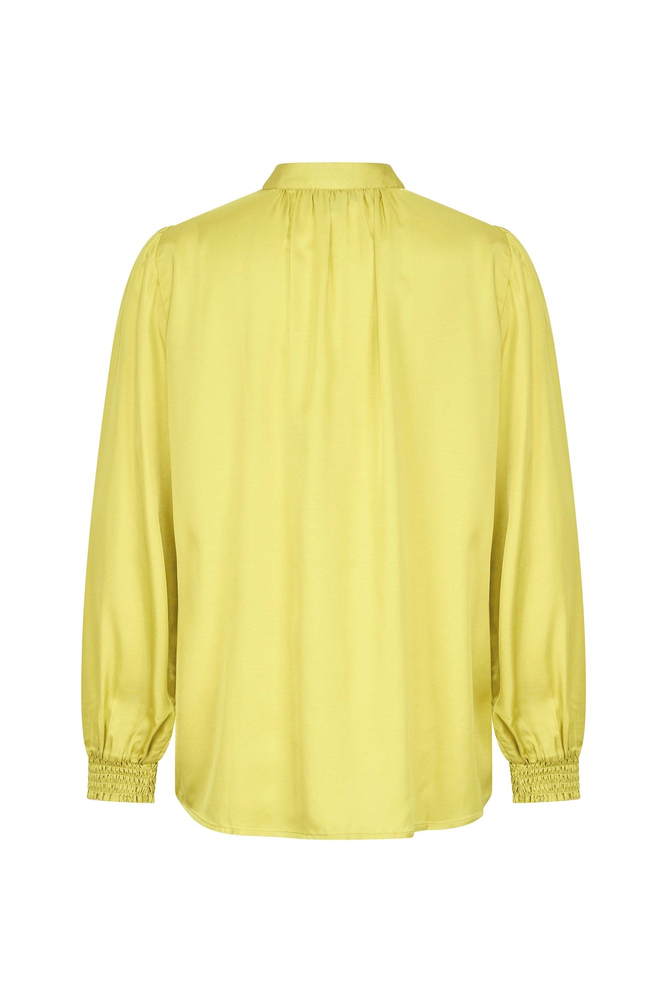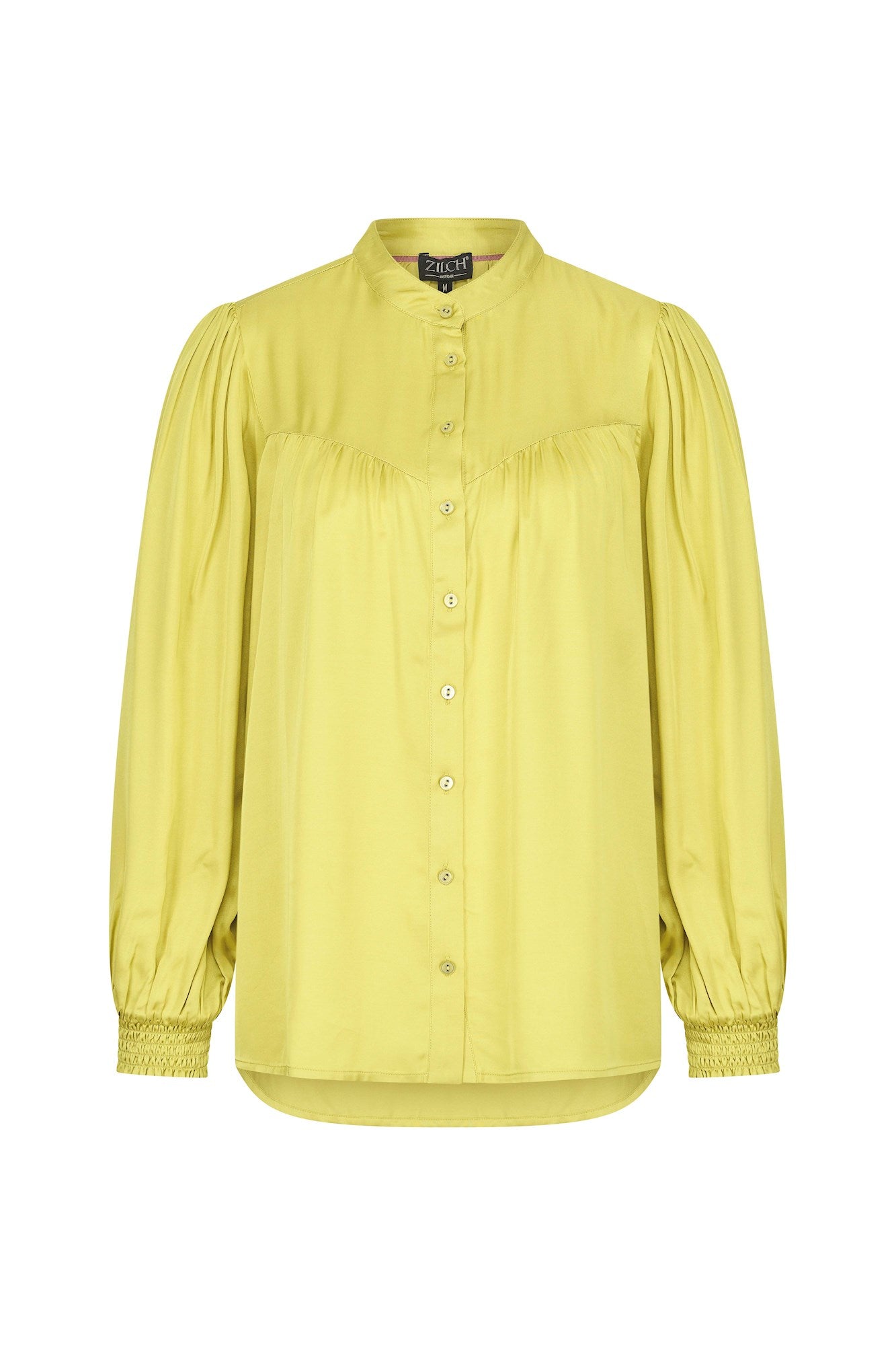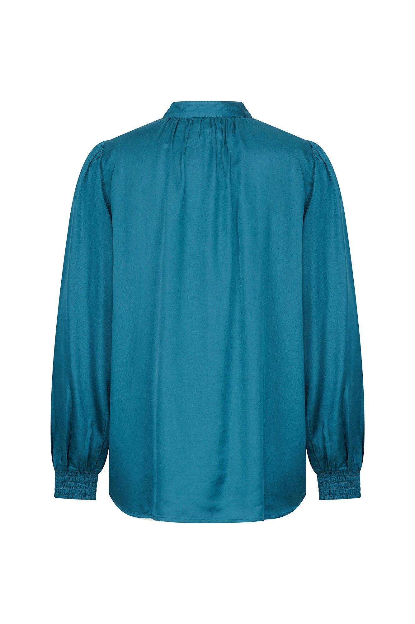 Feestelijke satijnen blouse met knoopsluiting en korte opstaande kraag in prachtige kleuren. Dit losser vallende model heeft geplooide wijde mouwen met gesmokt manchet.