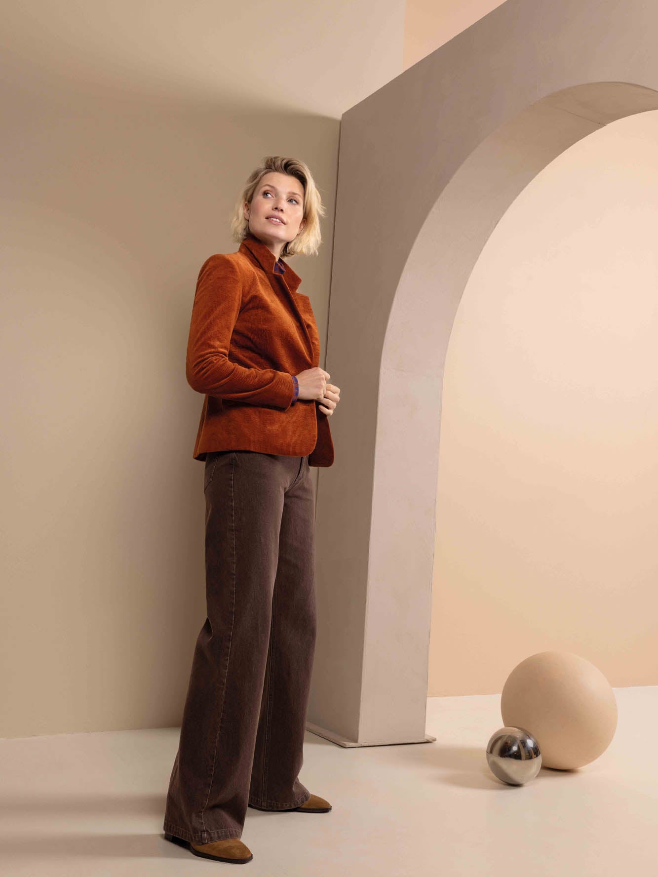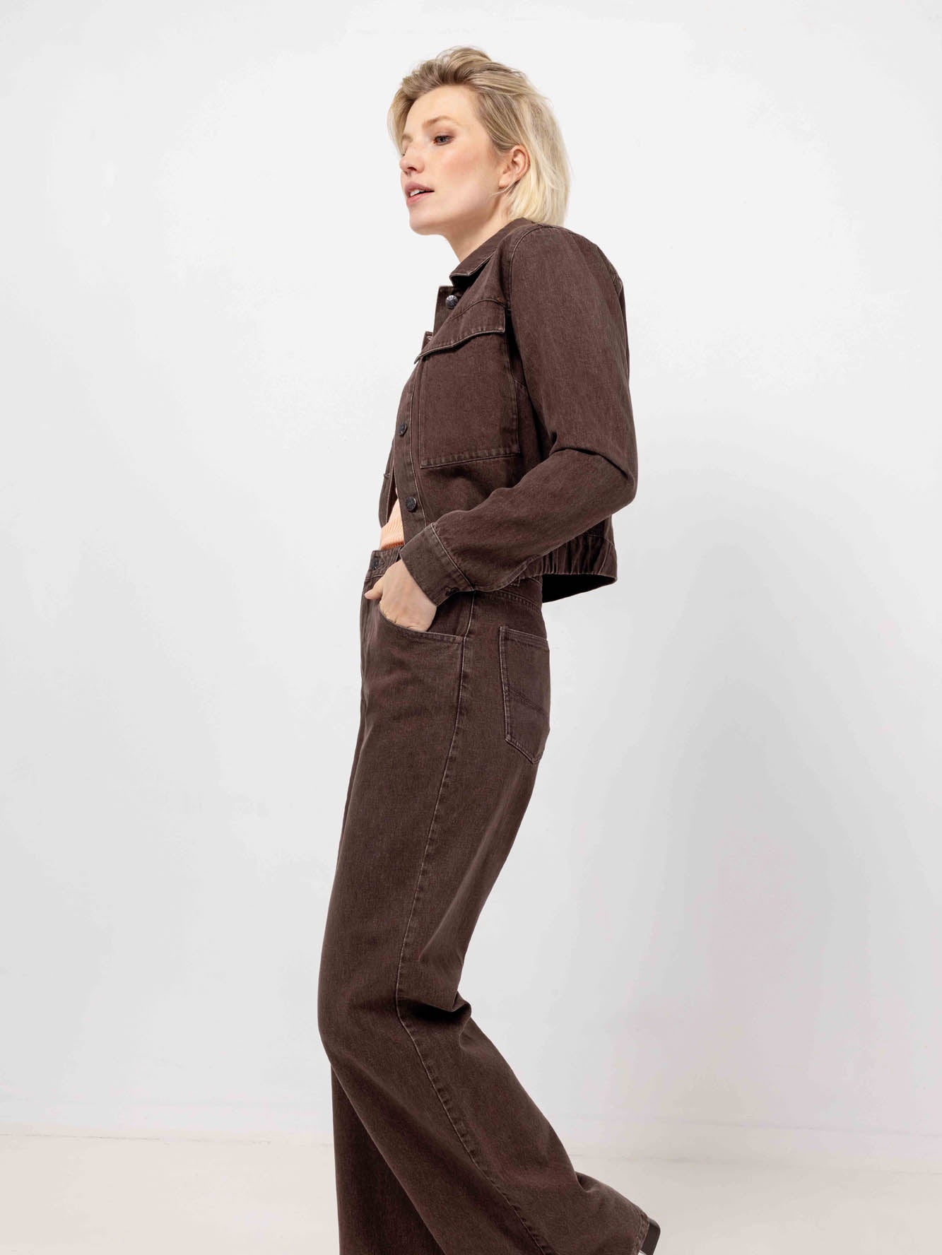 Eigentijdse spijkerbroek met wijde pijp en medium hoge taille in stoere bruine spijkerstof. Mooi te combineren met de ‘Scotty' Jacket in dezelfde stof. De broek sluit met een rits en knoop en is in twee lengtematen verkrijgbaar: R (regular) en S (short).