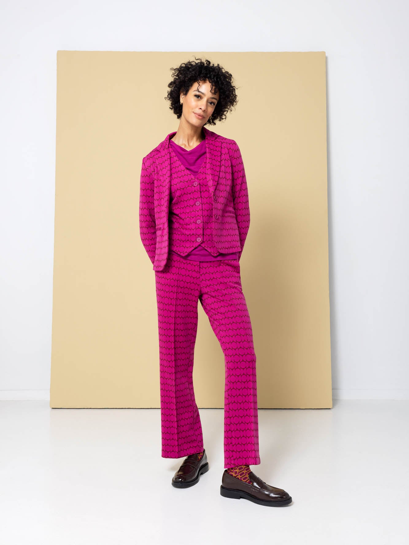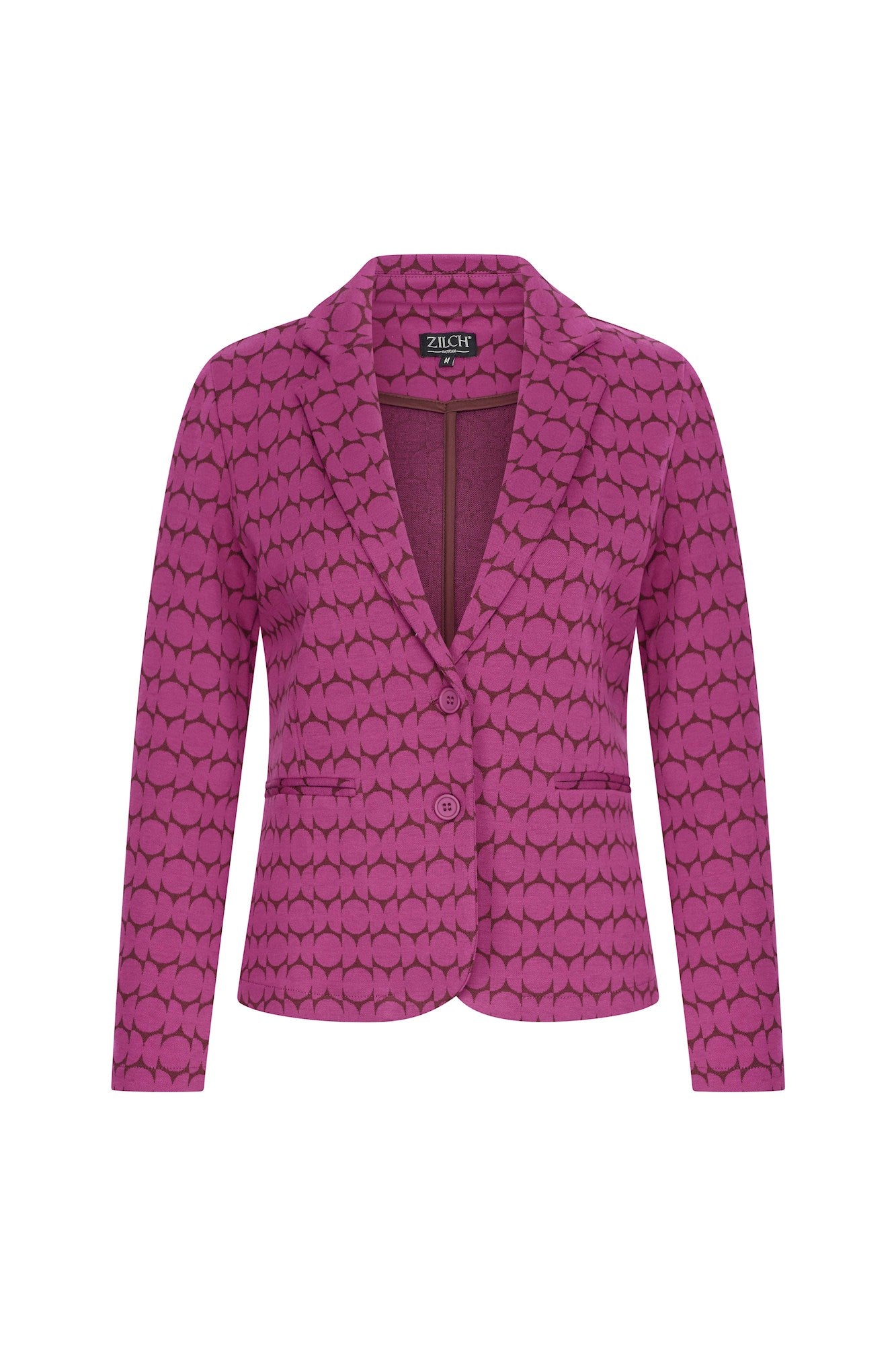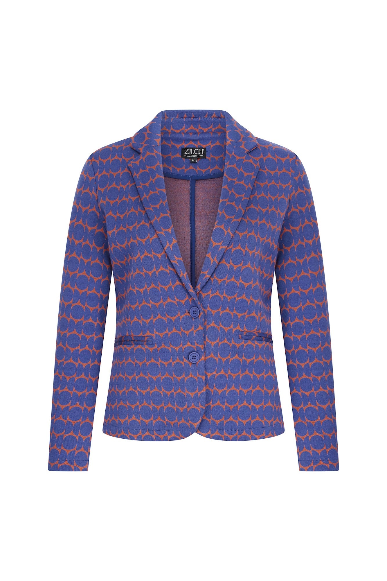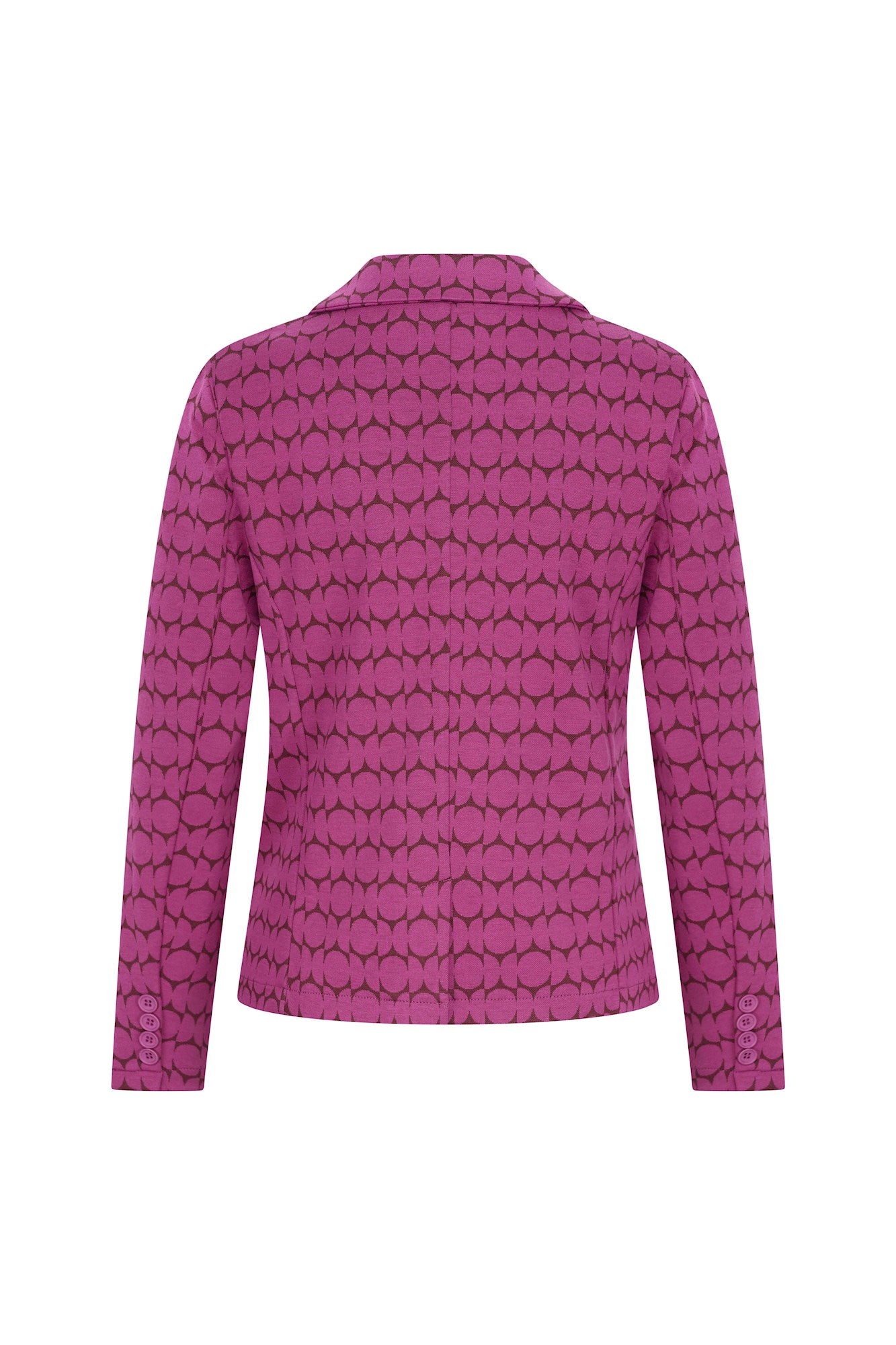 Mooi getailleerd Jersey colbert in trendy patroon met 2 knopen en twee paspel-zakjes. Lengte tot op de heup. Dit comfortabele jasje combineert uitstekend met de bijpassende broek voor een trendy outfit.