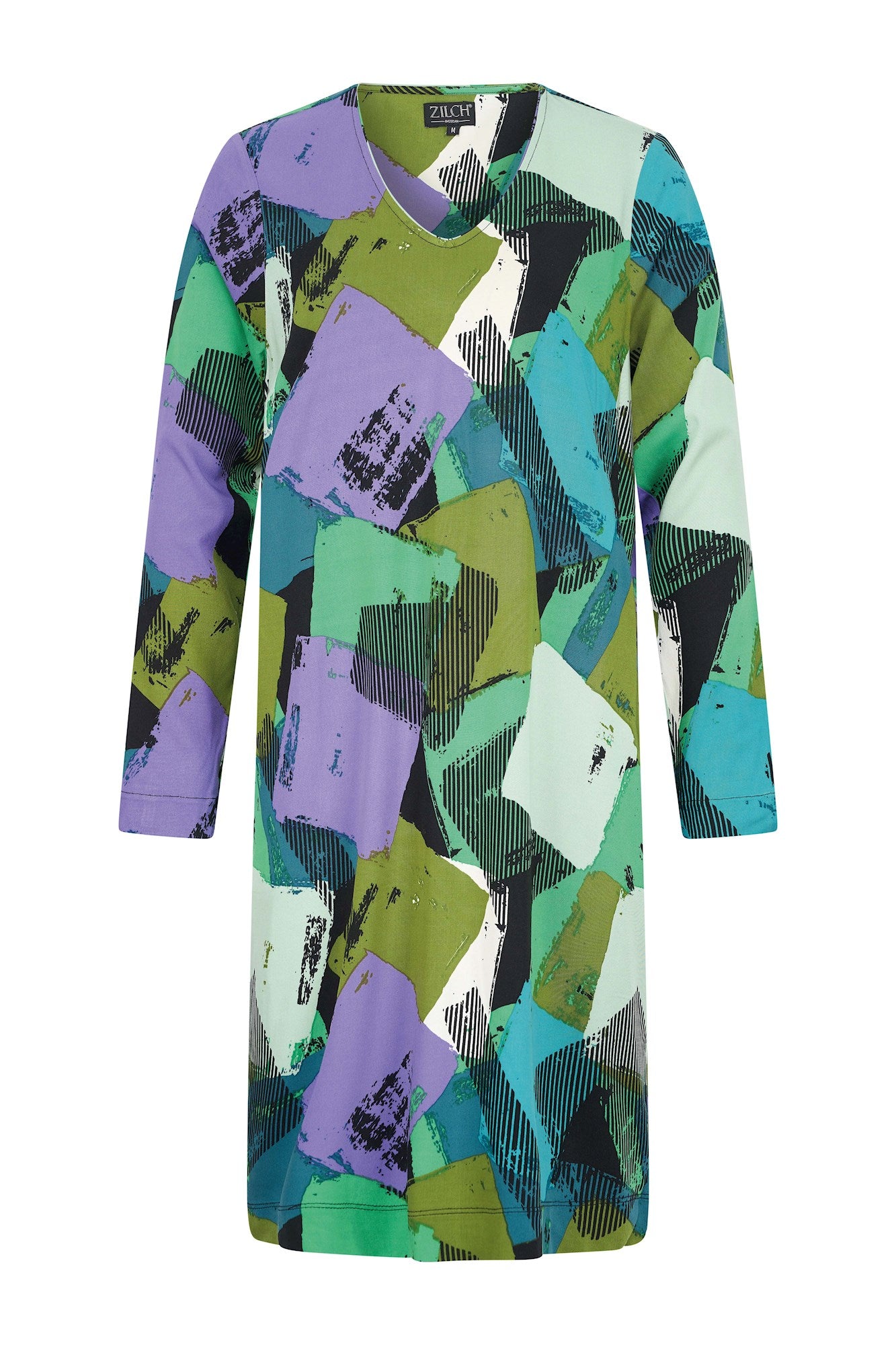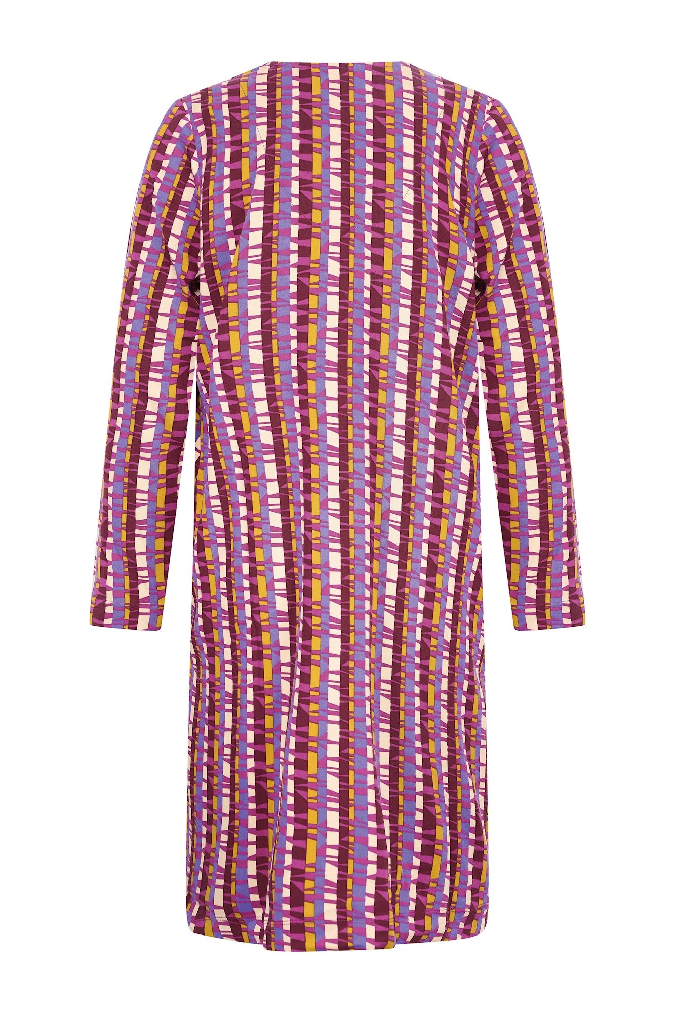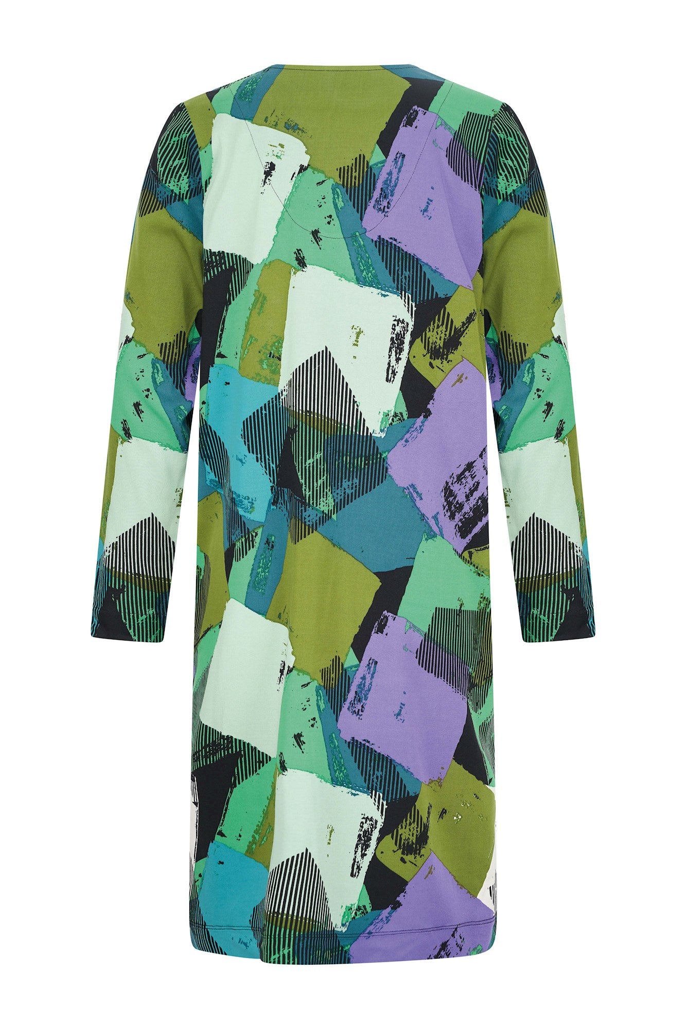 Wijdvallende jurk met V-hals en zakken. De jurk heeft lange mouwen en is gemaakt van een zachte viscose met een fijne stretch in een prachte winterse prints. Een terugkerende favoriet in onze collecties.