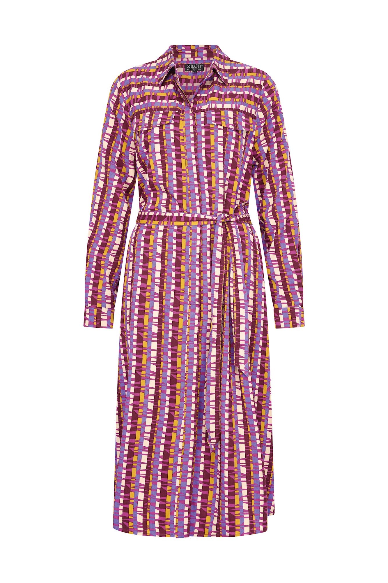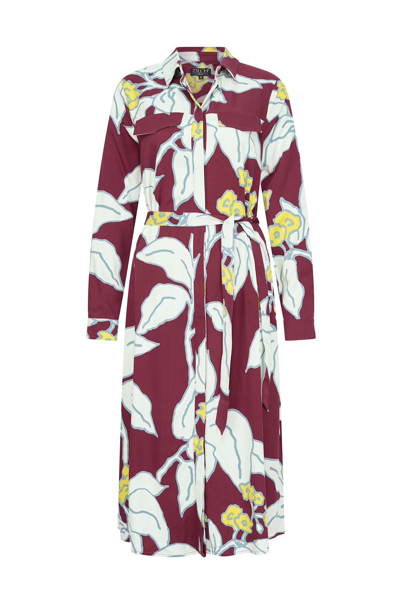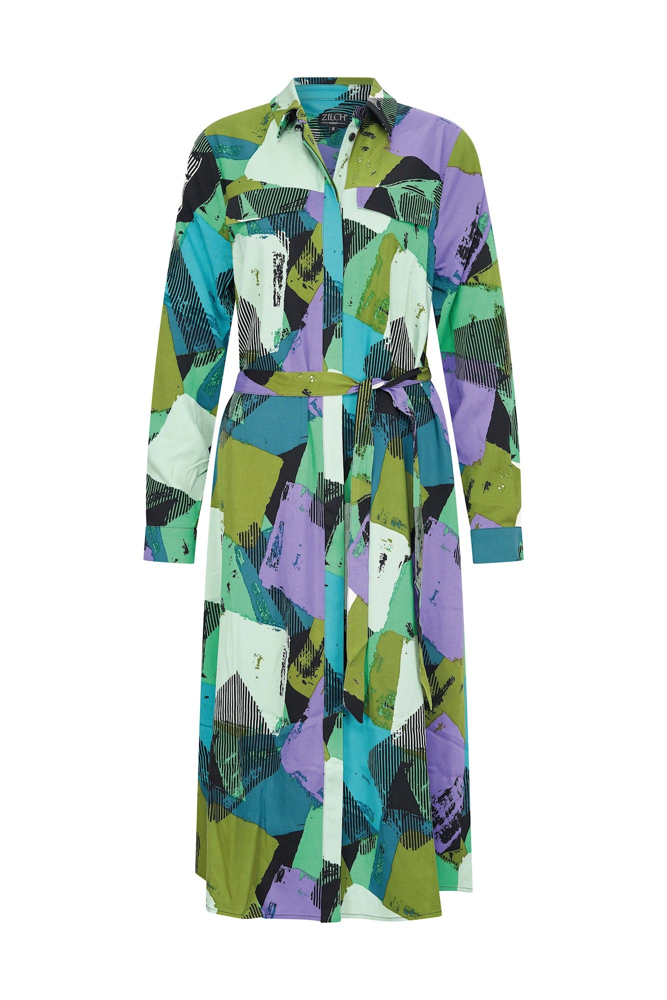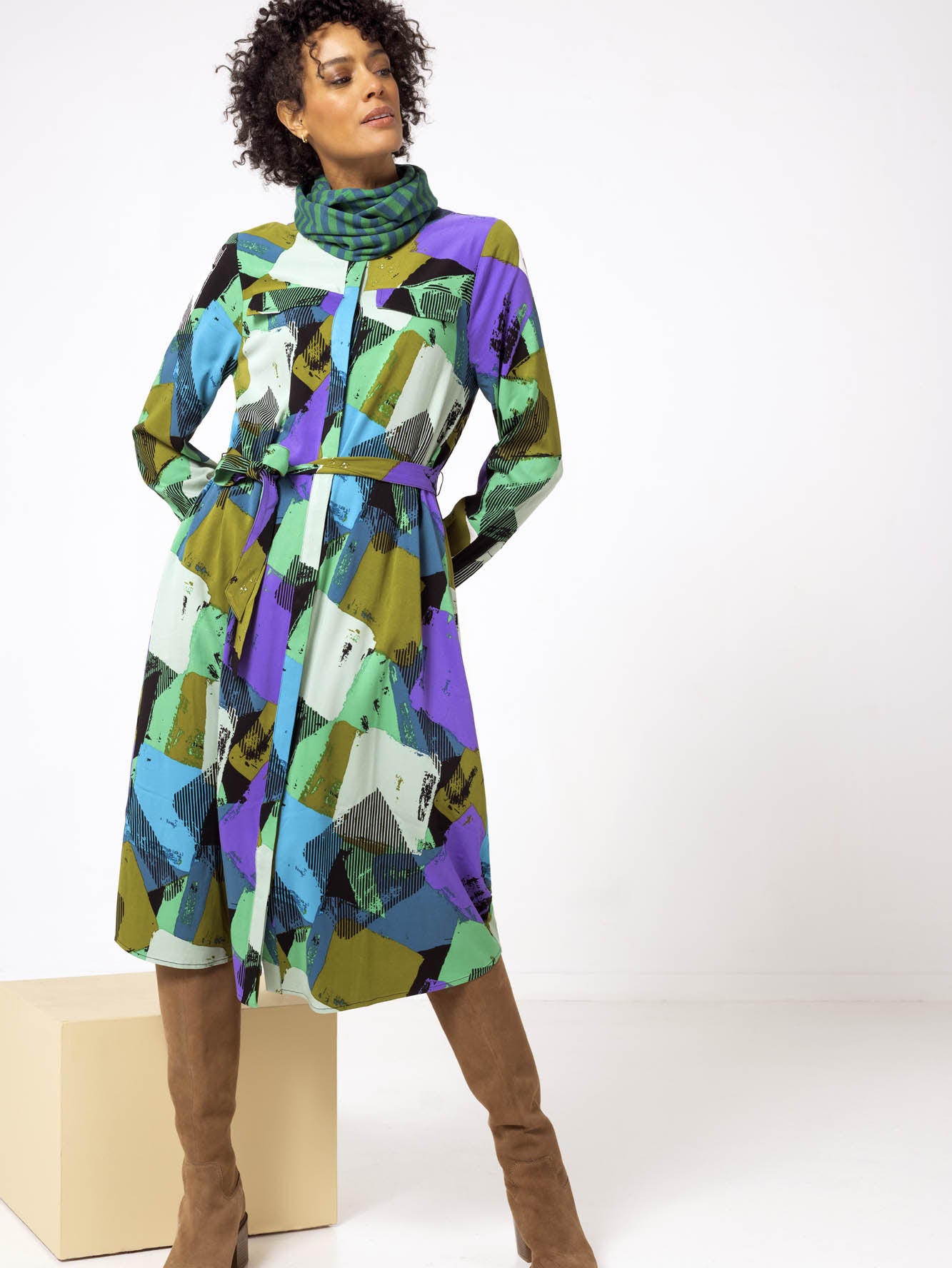 Lange doorknoopjurk met verborgen knoopsluiting, kraagje en de suggestie van borstzakjes. Het wat rechtere model geef je taille met de bijpassende ceintuur.