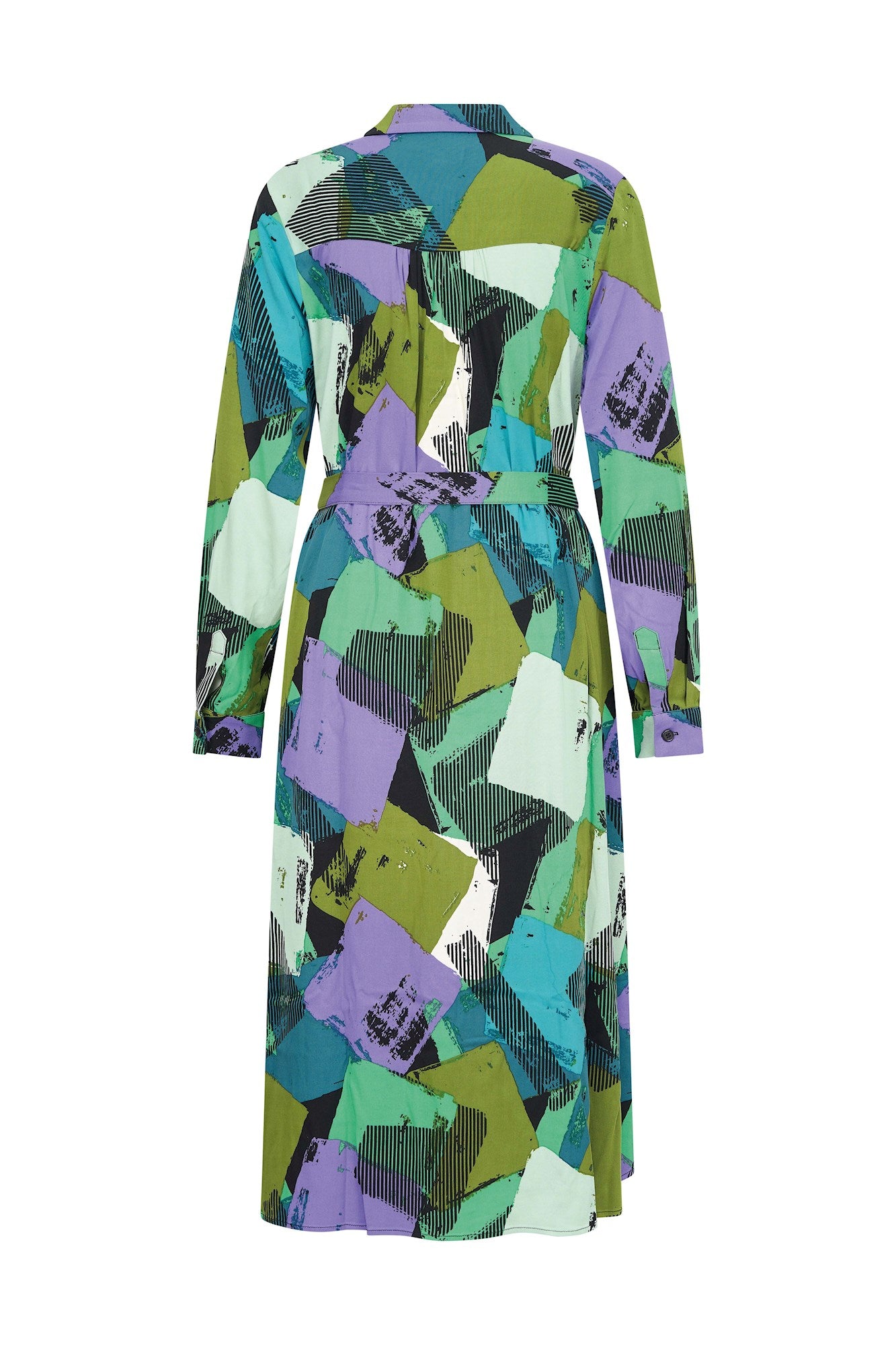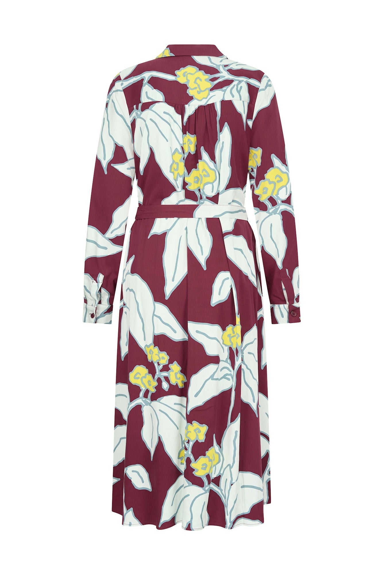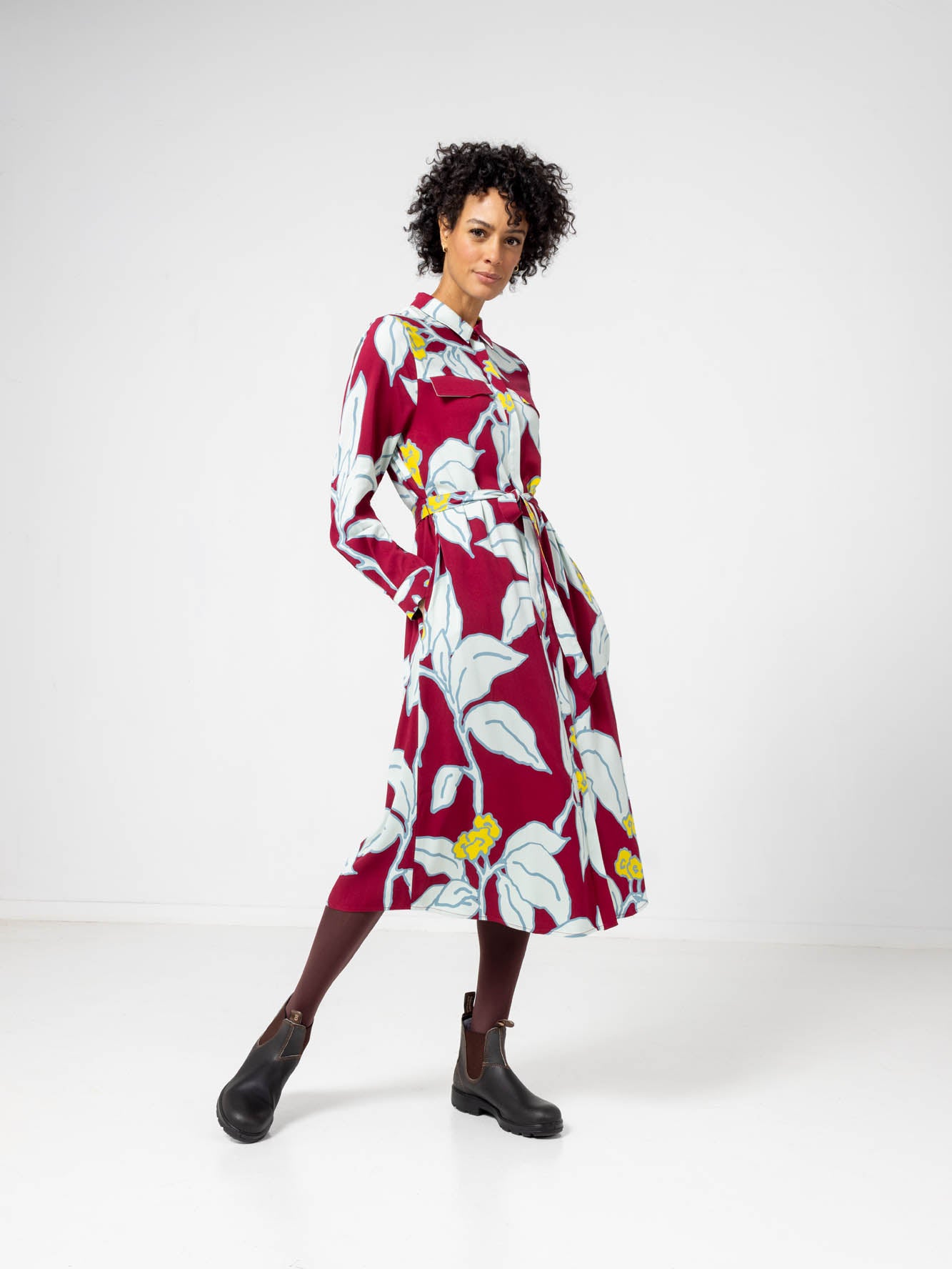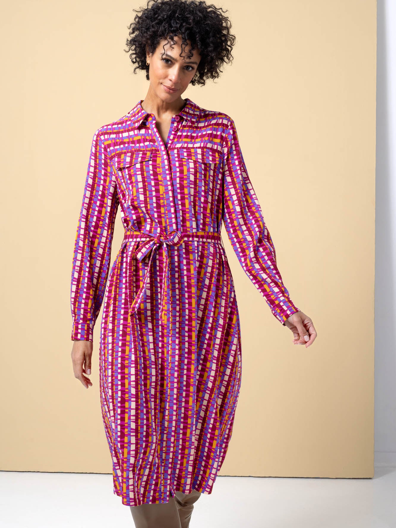 Lange doorknoopjurk met verborgen knoopsluiting, kraagje en de suggestie van borstzakjes. Het wat rechtere model geef je taille met de bijpassende ceintuur.