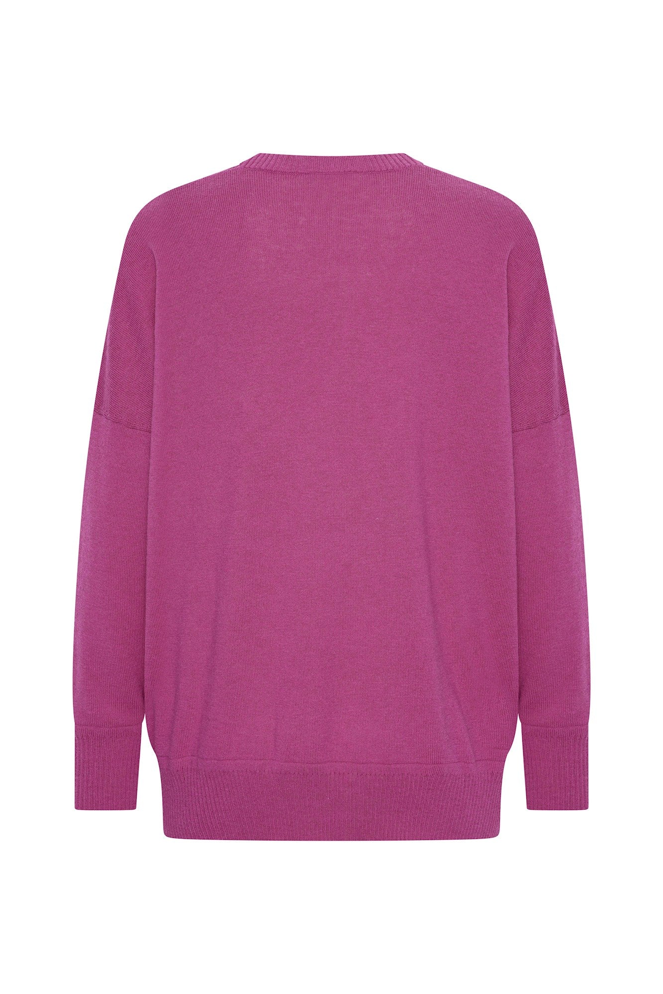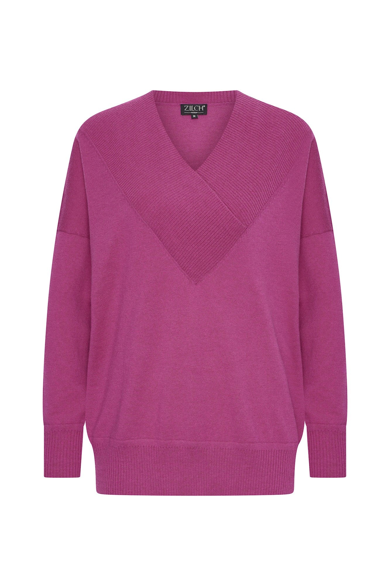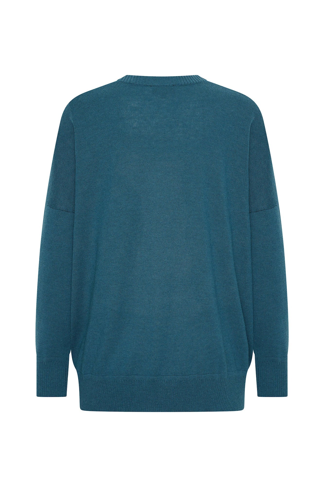 Heerlijke warme trui van zachte wol-katoen mix met bijzondere v-hals, verlaagde schoudernaden en ruimvallende oversized pasvorm. De hals is afgewerkt met een brede ribboord met overslag. Een heerlijke trui voor koudere dagen.