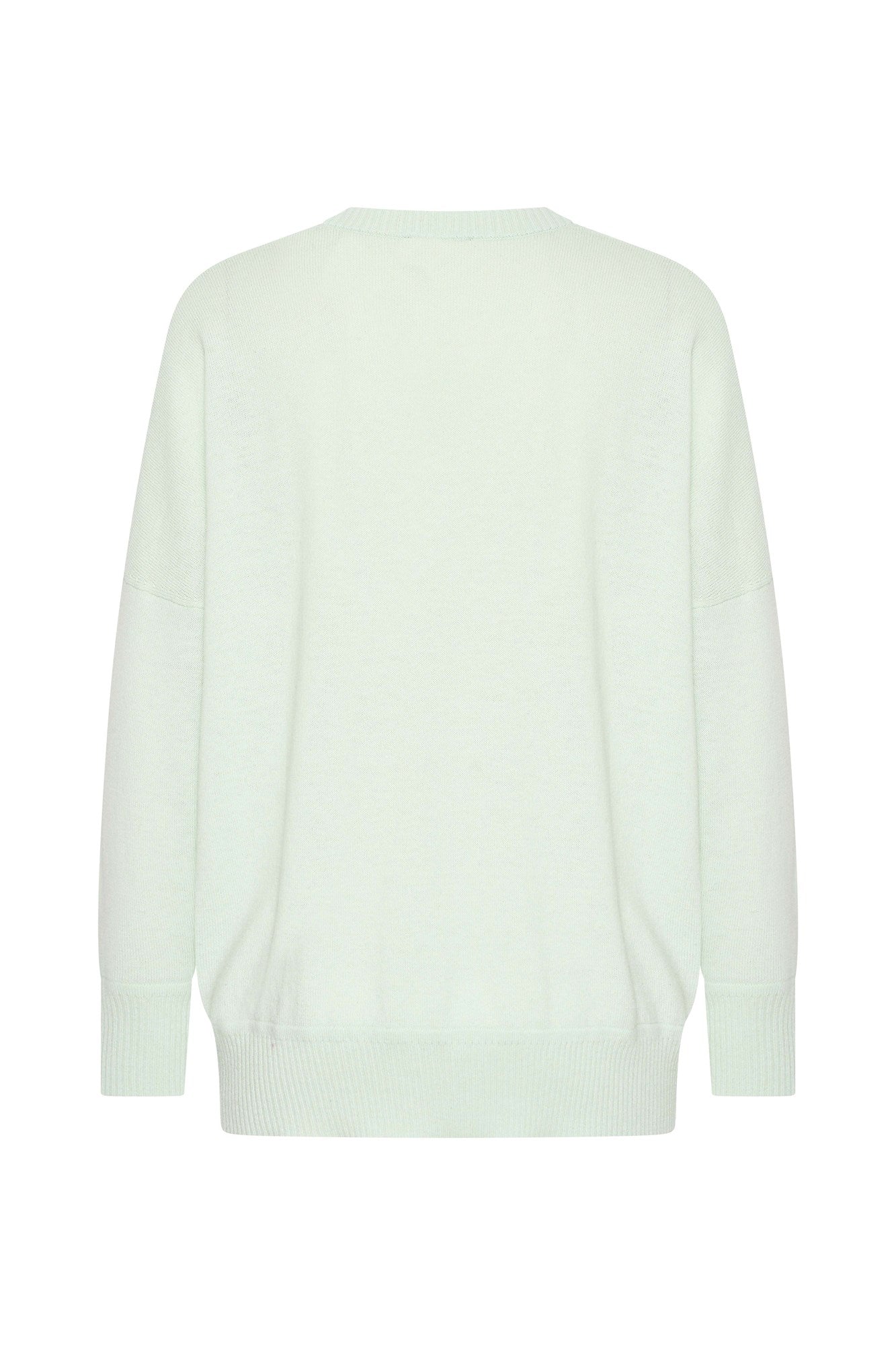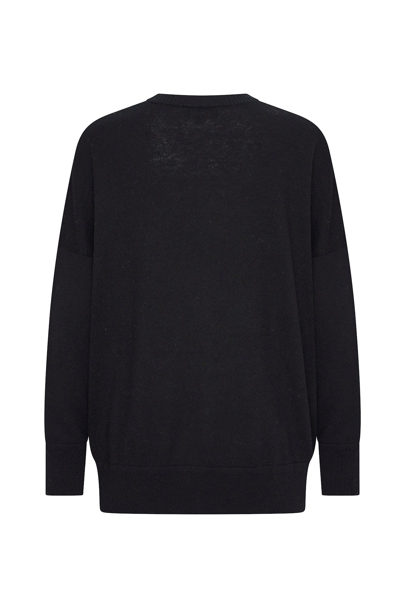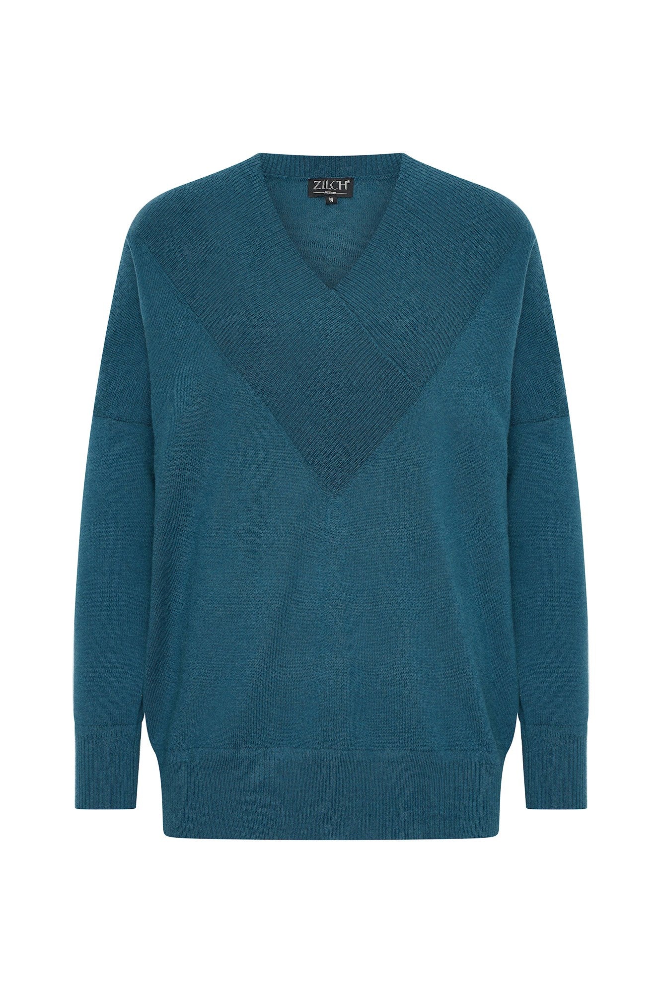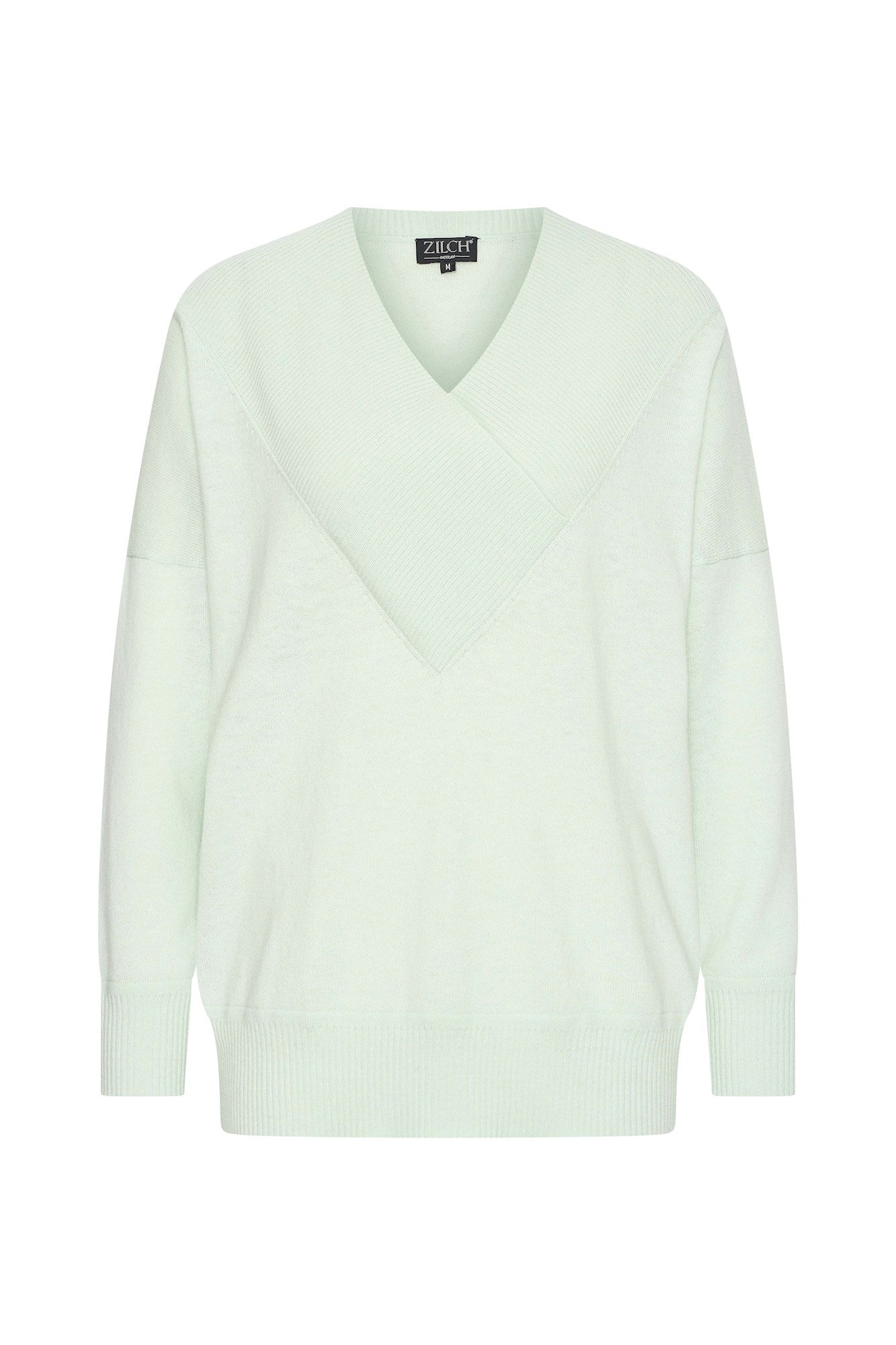 Heerlijke warme trui van zachte wol-katoen mix met bijzondere v-hals, verlaagde schoudernaden en ruimvallende oversized pasvorm. De hals is afgewerkt met een brede ribboord met overslag. Een heerlijke trui voor koudere dagen.
