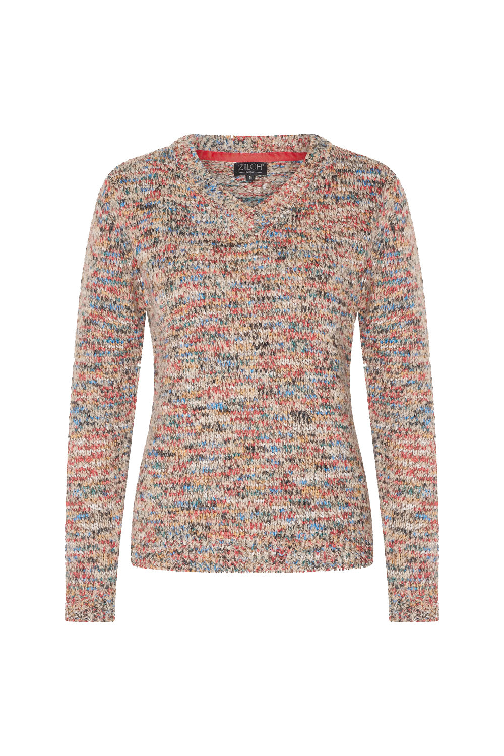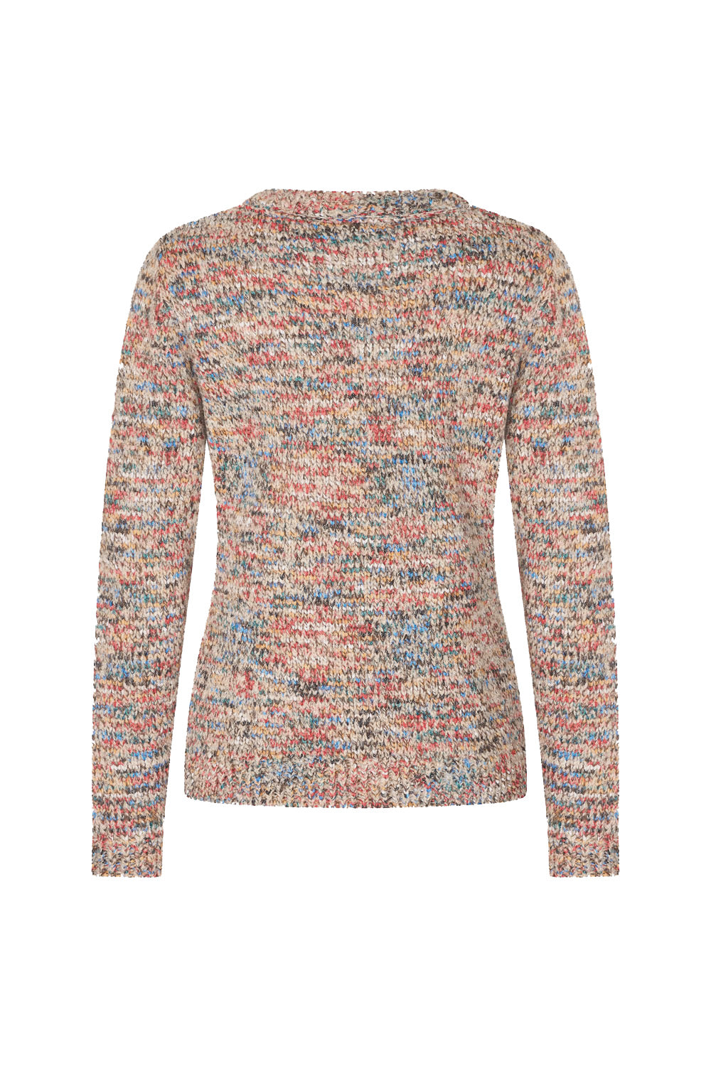 Warme trui met lange mouwen, aansluitende pasvorm en V-hals. Deze praktische en stijlvolle trui is gemaakt van een kleurrijk gemêleerd breisel in wol-mix, staat superleuk over onze blousejes en is daarmee het fijne extra laagje op koude dagen in de winter.